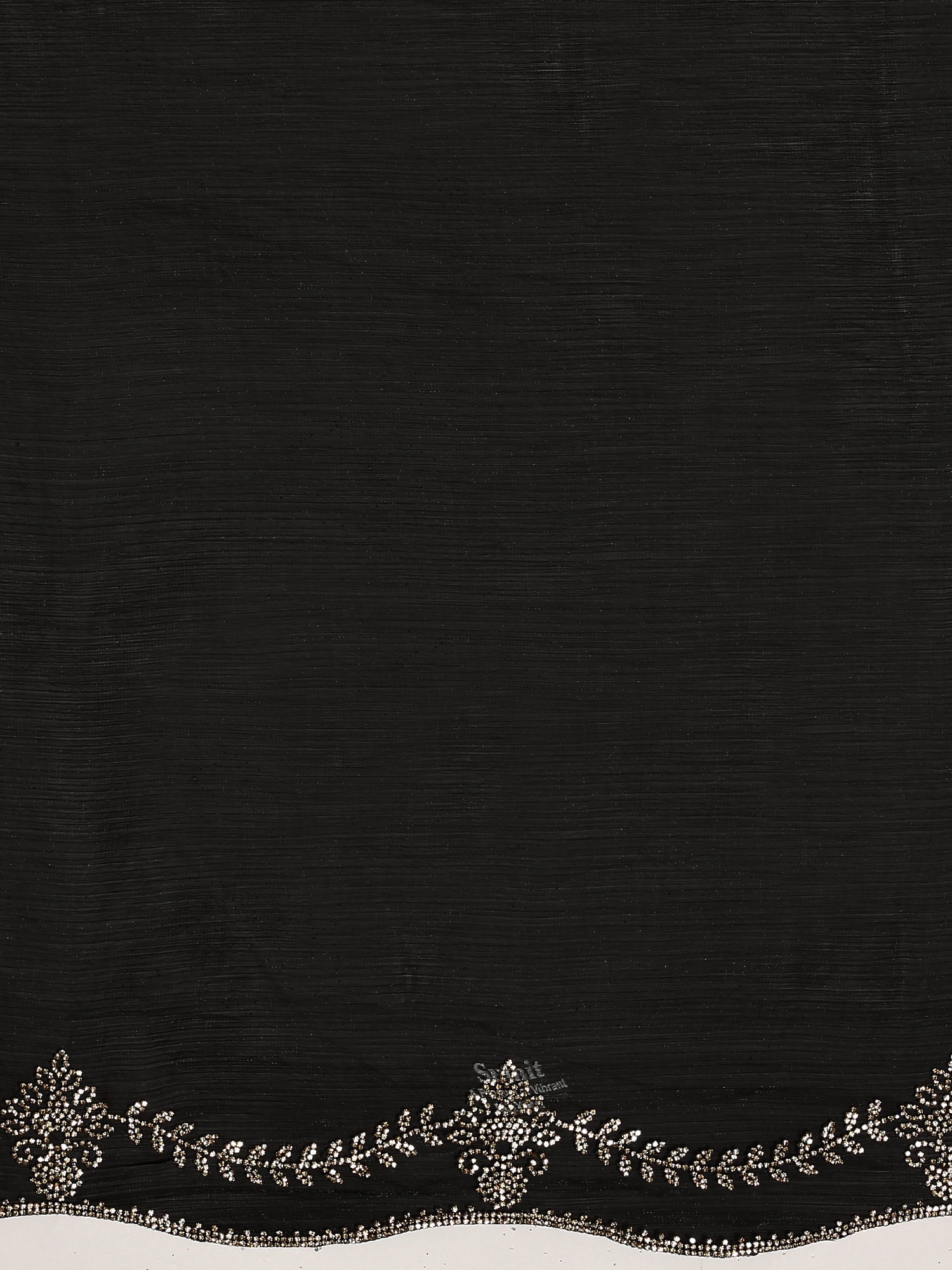 This exquisite Black Jimmy Tissue Saree features delicate hand embroidery, adding an elegant touch to its lightweight and smooth texture. Perfect for formal occasions, its refined craftsmanship ensures a graceful drape, making it a timeless addition to your wardrobe.