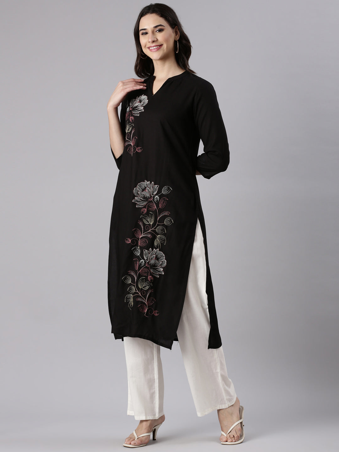 Elevate your ethnic wardrobe with this Black Rayon Embroidered Kurta, crafted for a refined and sophisticated look. The breathable rayon fabric ensures comfort while the delicate embroidery adds a touch of timeless elegance. Perfect for both formal occasions and stylish everyday wear, this kurta seamlessly combines tradition with contemporary charm.