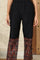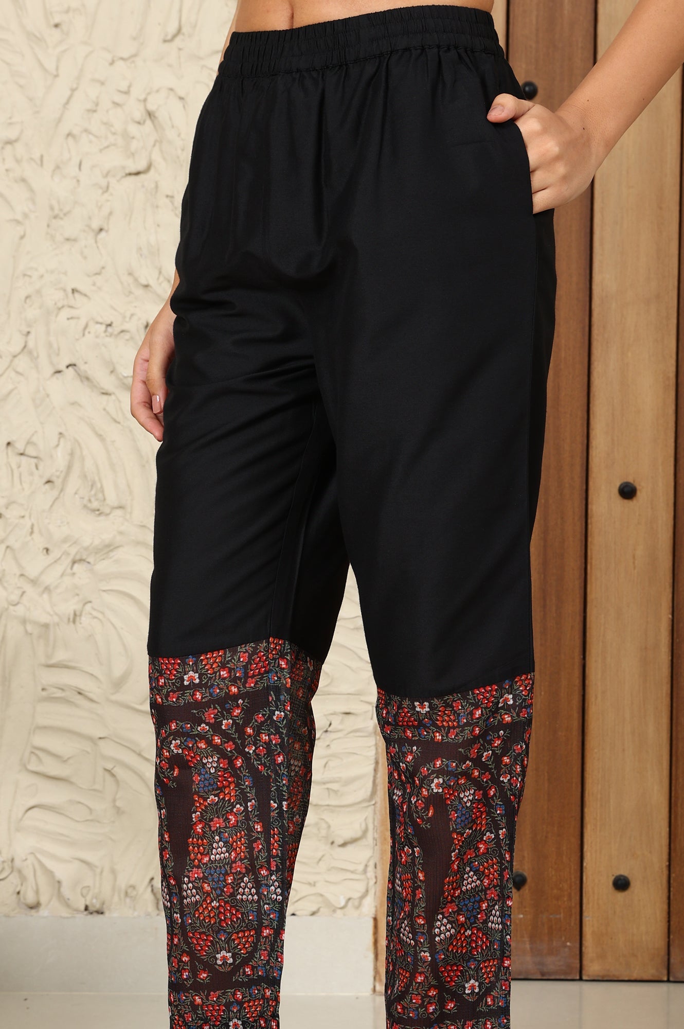 Elevate your wardrobe with this stunning black solid embroidered straight kurta set. The set has a masterpiece kurta which crafted in premium fabric. Its sleek silhouette is adorned with vibrant metallic embroidery and delicate sequin embellishments, adding a touch of sparkle and sophistication. The kurta is paired with matching solid straight pants which has printed kota hemline for a streamlined look, while the ensemble is completed with a floral kota print drape featuring a chic tape border. This outfit beautifully combines traditional craftsmanship with contemporary elegance, making it perfect for any festive or formal occasion.