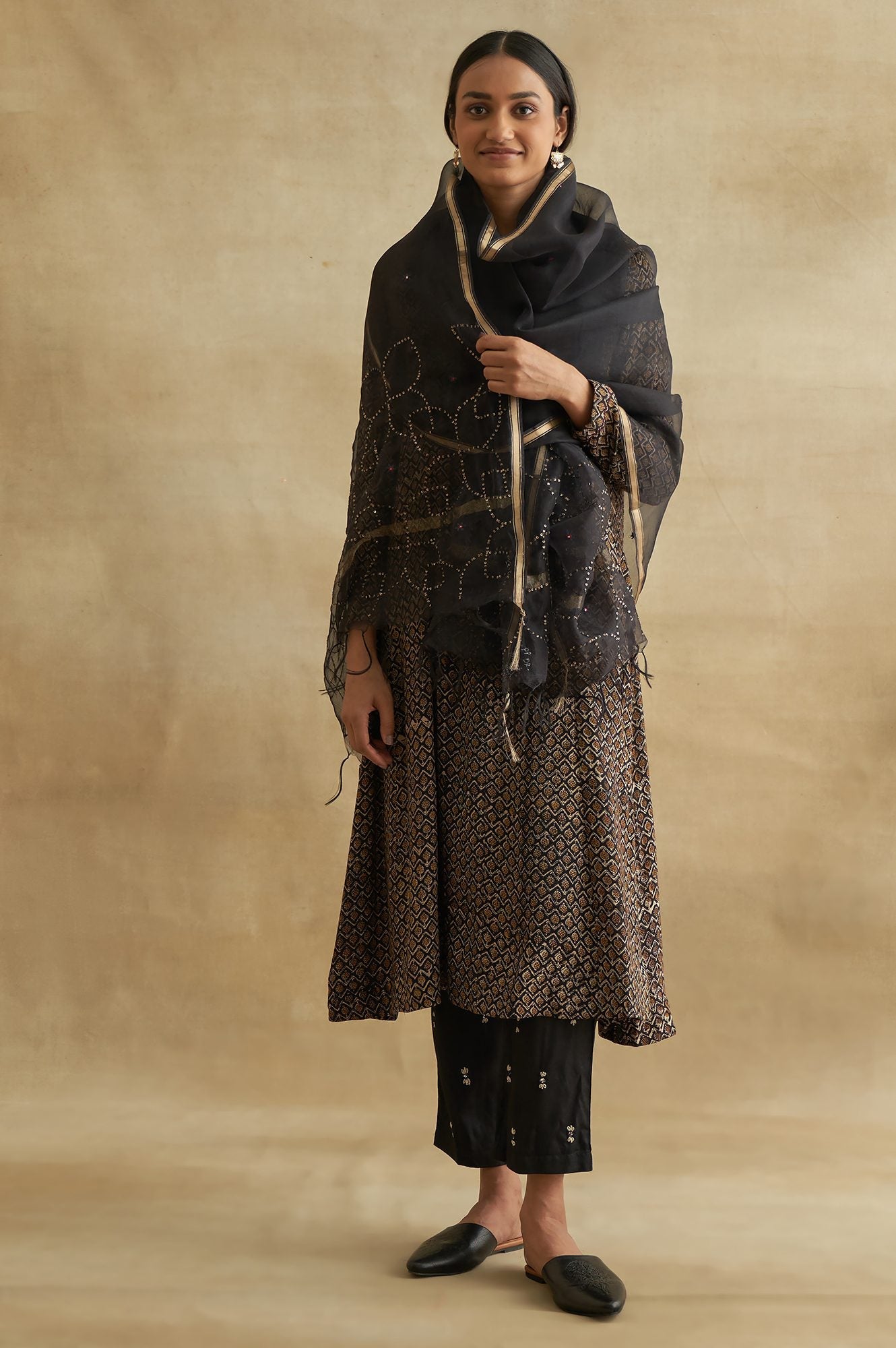 Black Solid Straight Pants With Two Pockets And Drawstring, Featuring Mirrorwork Embroidery At Hem.