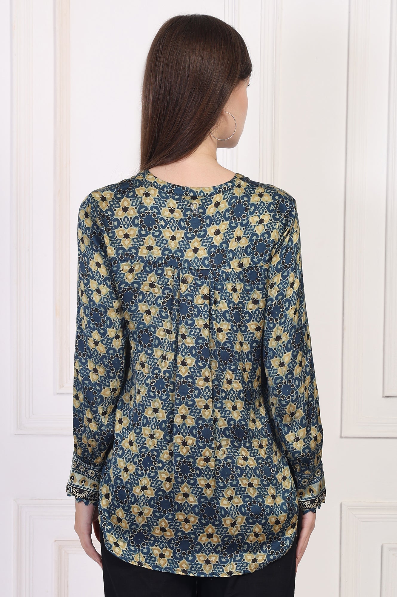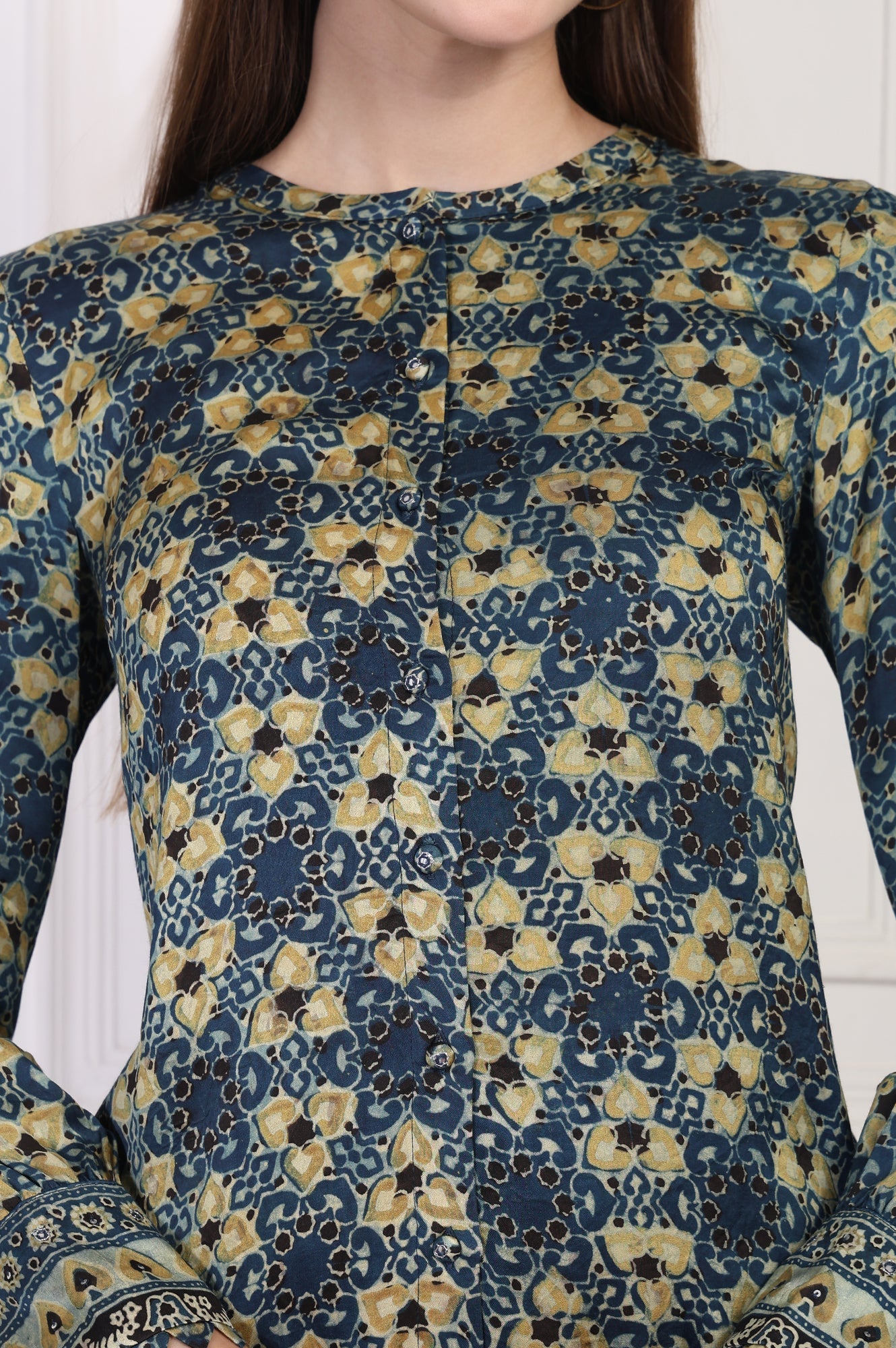 Effortlessly chic! This modal top for women features a captivating abstract print in a rich blue hue, complemented by a mandarin collar and long sleeves. The button-down design adds a touch of sophistication, while the straight silhouette ensures comfort and versatility. Perfect for casual outings or office wear, this breathable modal top is a must-have for your wardrobe. Pair it with tailored trousers or jeans for a polished look that transitions seamlessly from day to night.