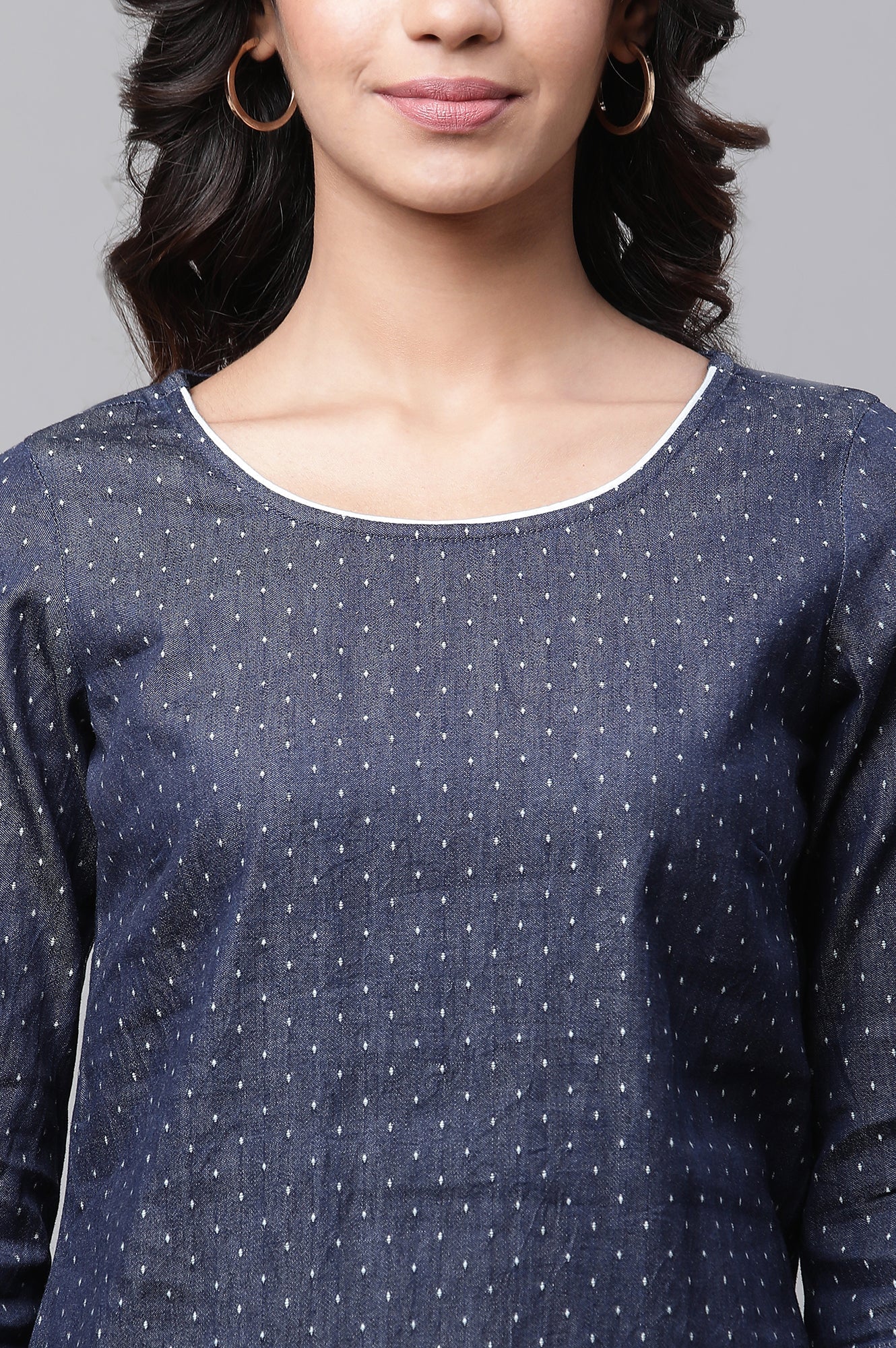 Crafted in premium fabric, which gives you all day comfort and classy look. This short denim kurti has round neck and white dot print.