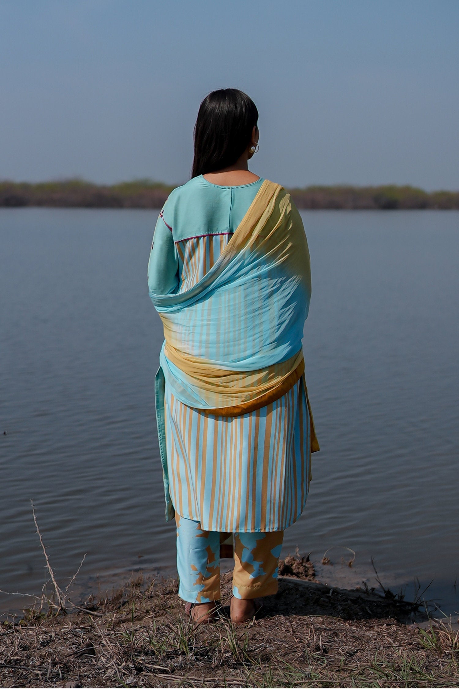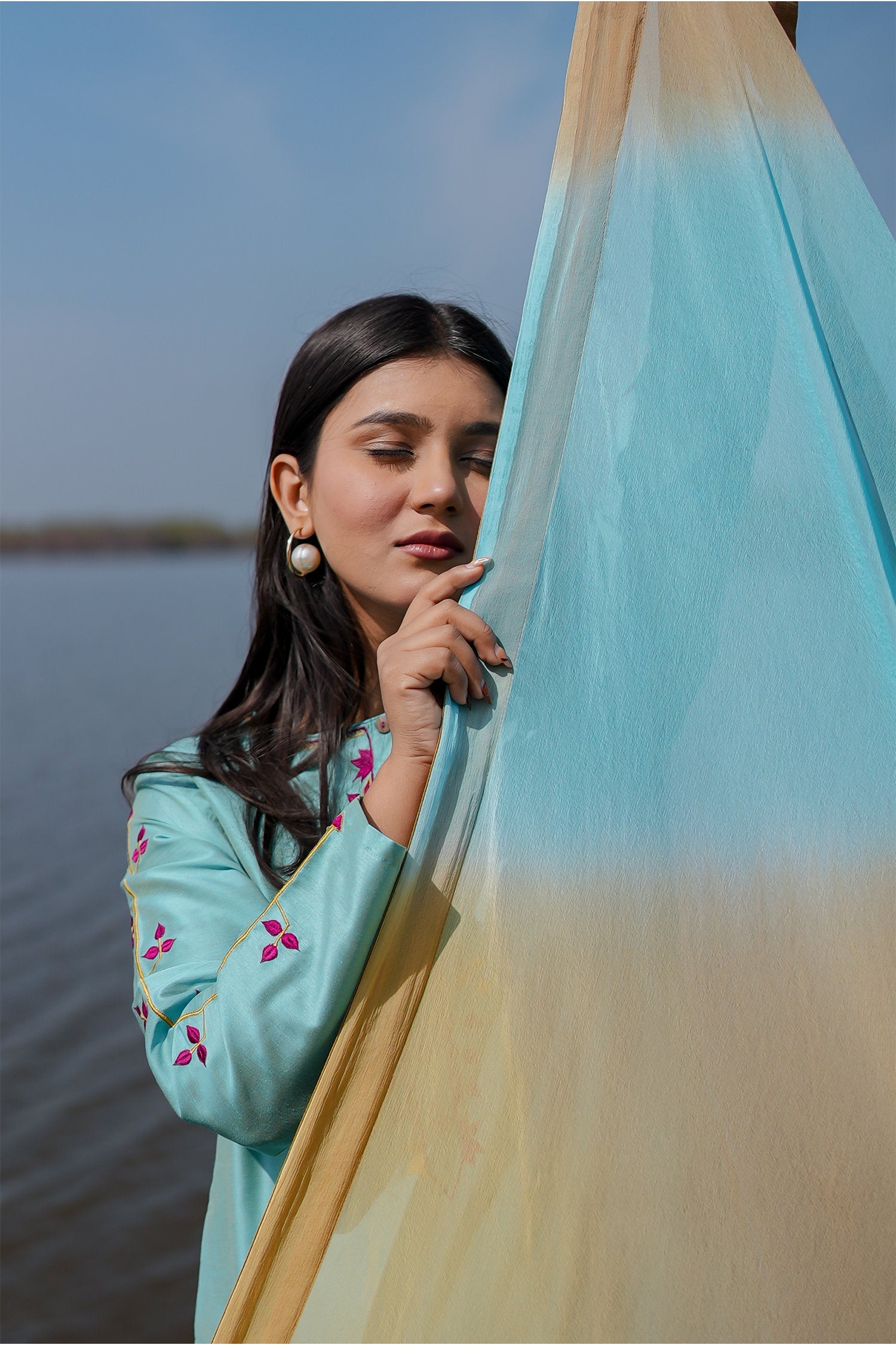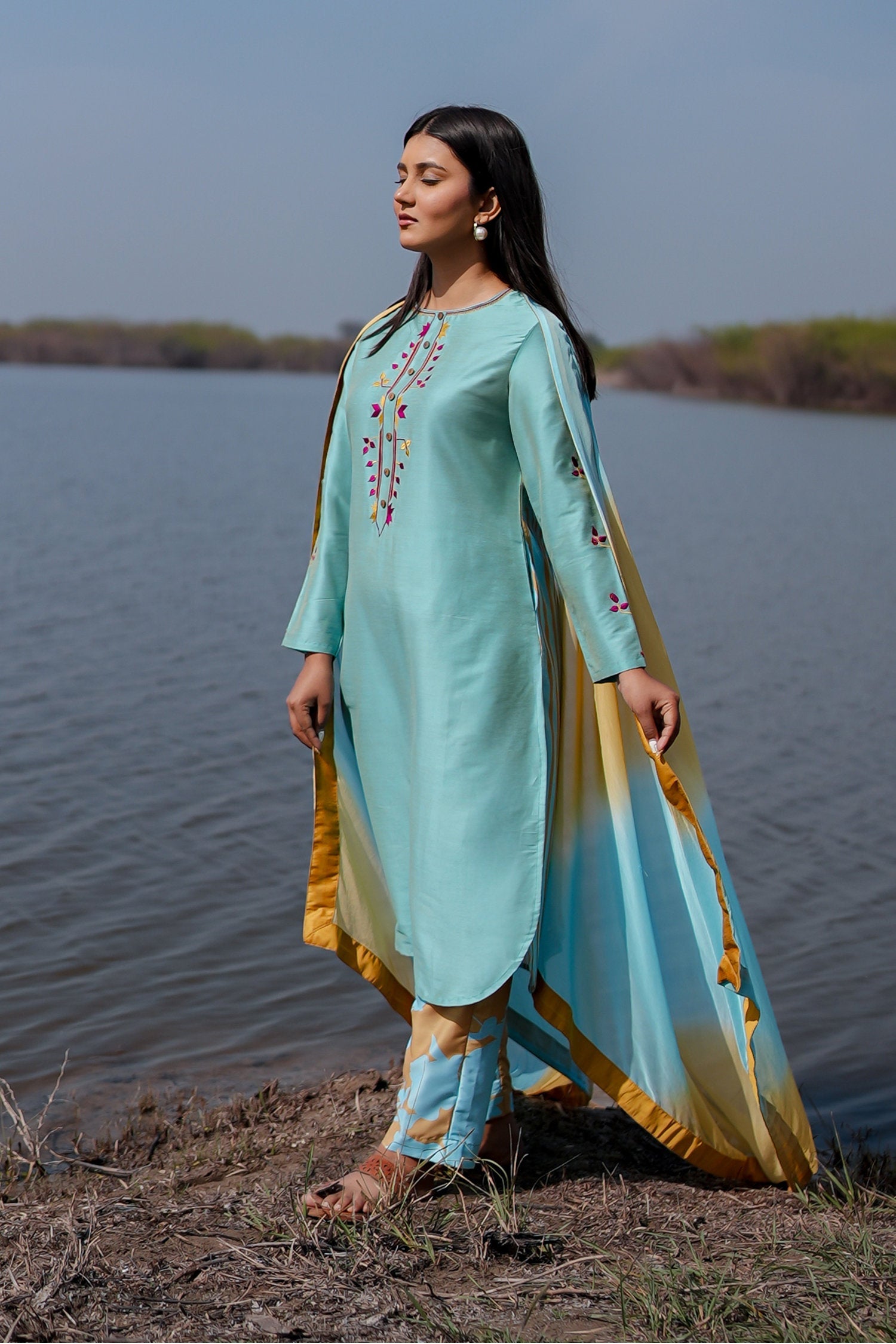 The blue cotton kurta set with hand embroidery and chiffon dupatta for a beautiful and stunning look with traditional touch.