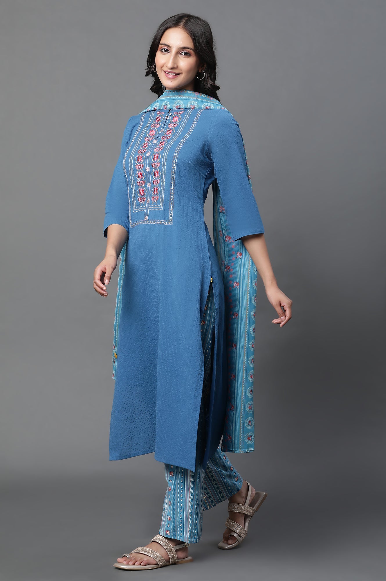 Blue Embroidered Seer Sucker Straight Kurta, Palazzo and Dupatta Set