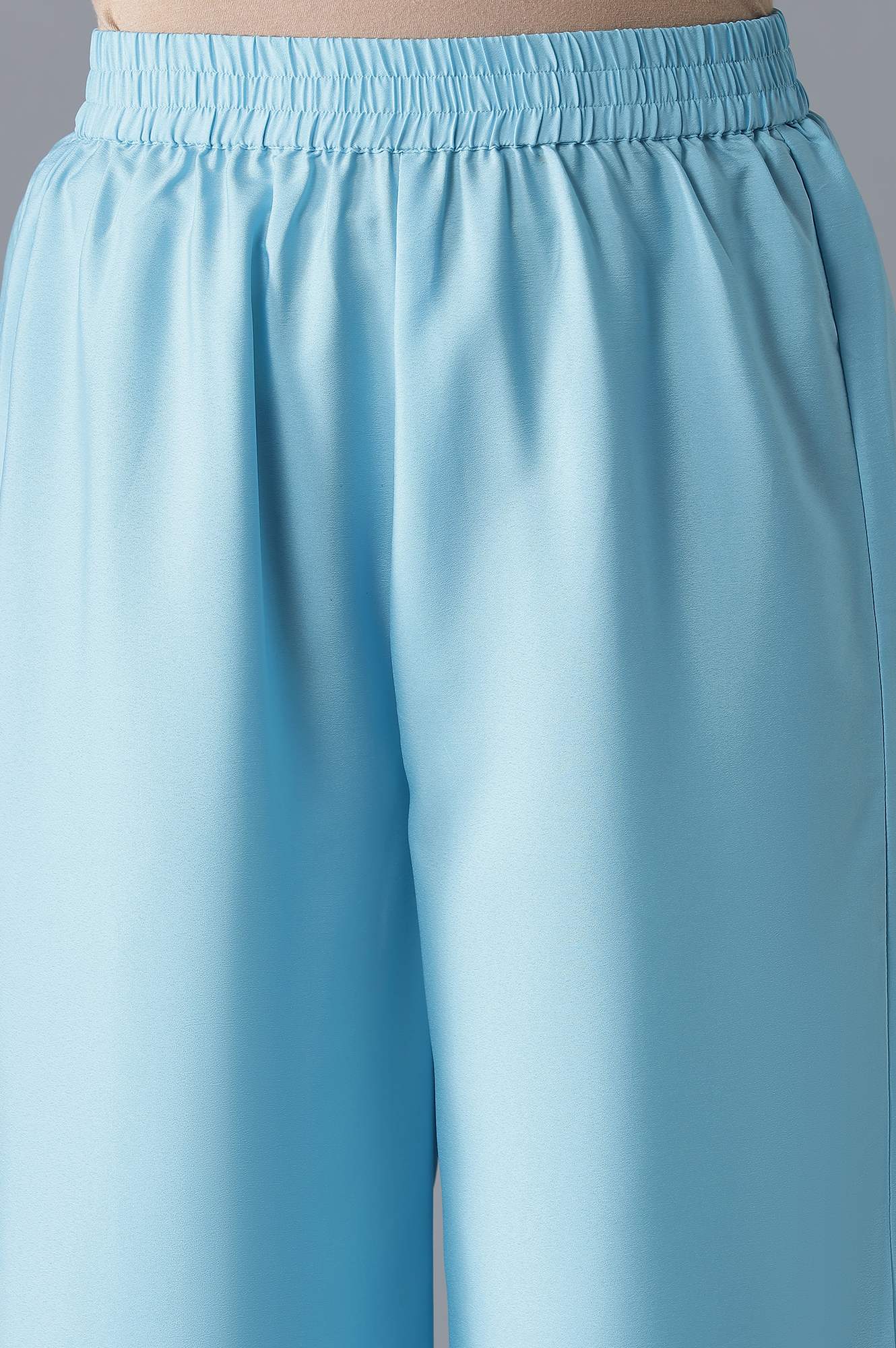 Go forth and dazzle them with this classy yet trendy kurta set. Featuring a blue all-over geometric print kurta that has a zari embroidered round neck and three-quarter sleeves. Well-matched with ankle length solid flared palazzos.