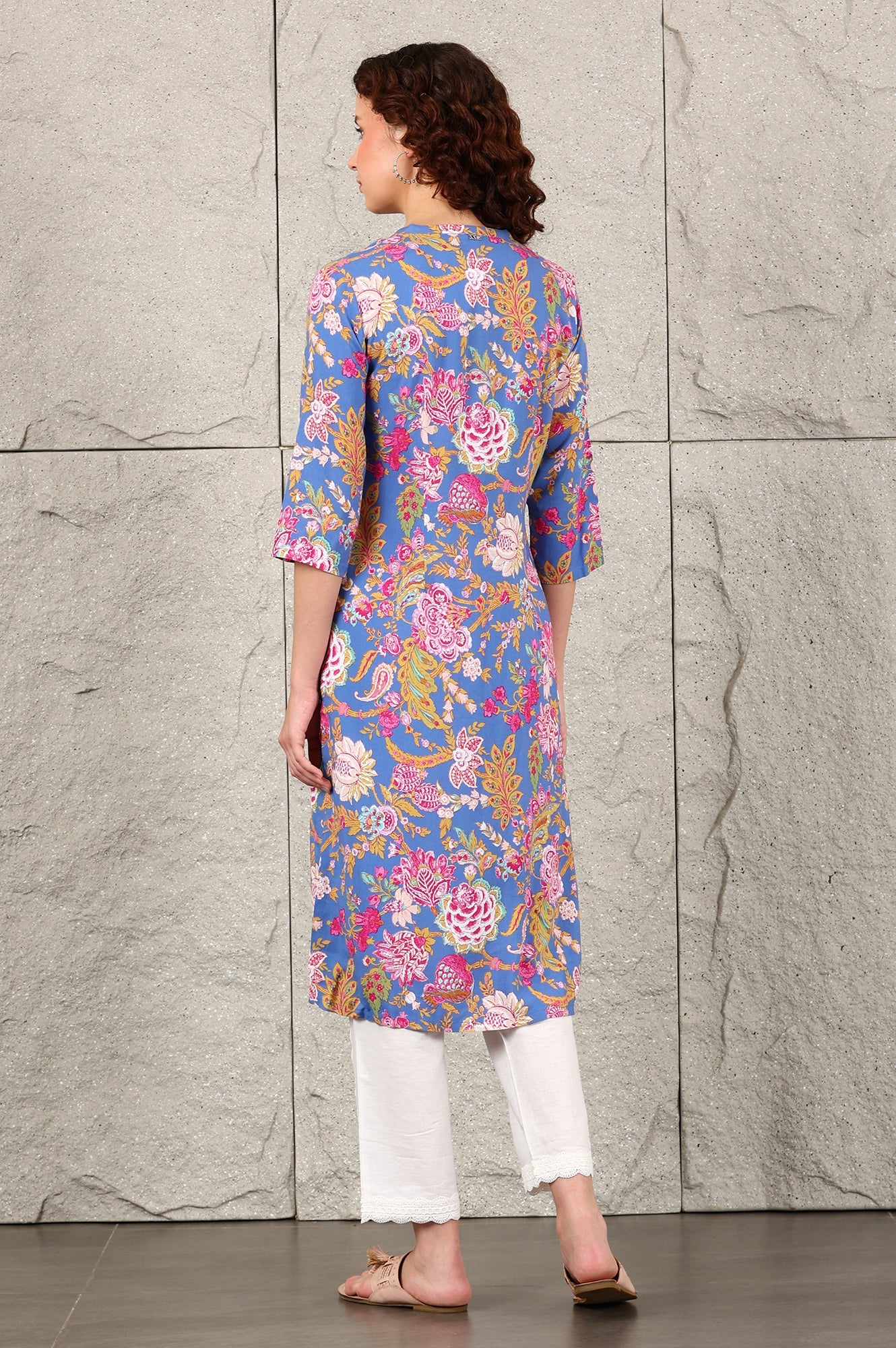 Blue Floral Printed Rayon Straight Kurta