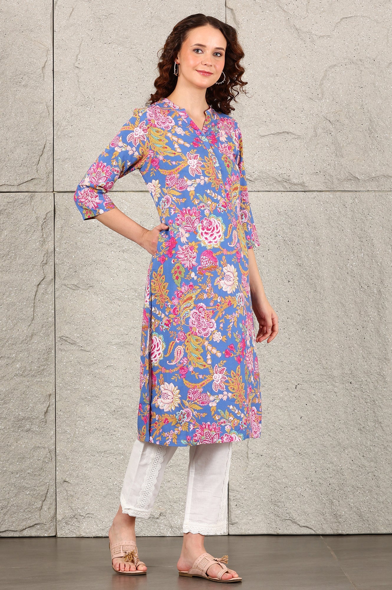 The Blue floral jaal printed straight kurta features a charming floral pattern on a rich blue hue, enhanced by a half mandarin collar and elegant placket detailing. Crafted from soft, breathable rayon, this kurta combines comfort with a touch of sophistication, making it a versatile addition to any wardrobe.
