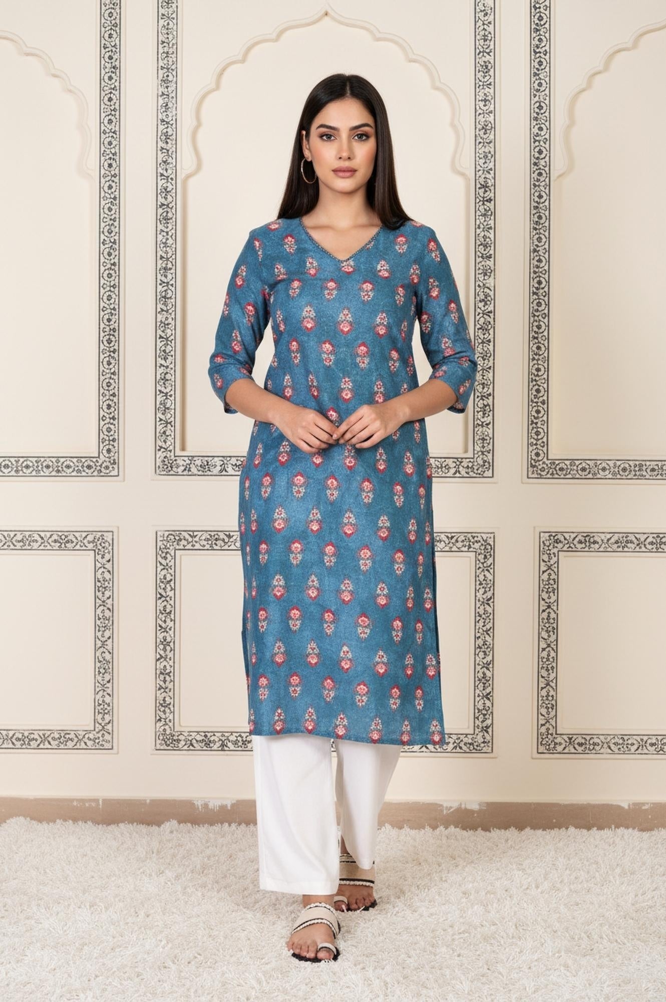 Effortlessly chic and versatile, this blue floral printed straight kurta is crafted from breathable cotton for all-day comfort. The V-neckline and three-quarter sleeves add a touch of elegance, while the straight silhouette ensures a flattering fit. Perfect for casual outings, office wear, or festive occasions, this kurta pairs beautifully with white palazzos or leggings. Its vibrant floral print and lightweight fabric make it a must-have for your wardrobe. Easy to maintain, simply machine wash to keep it looking fresh and stylish.
