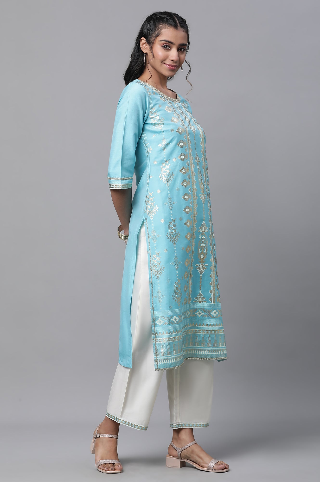 Blue Foil Printed Embellished Kurta, Pants and Dupatta Set