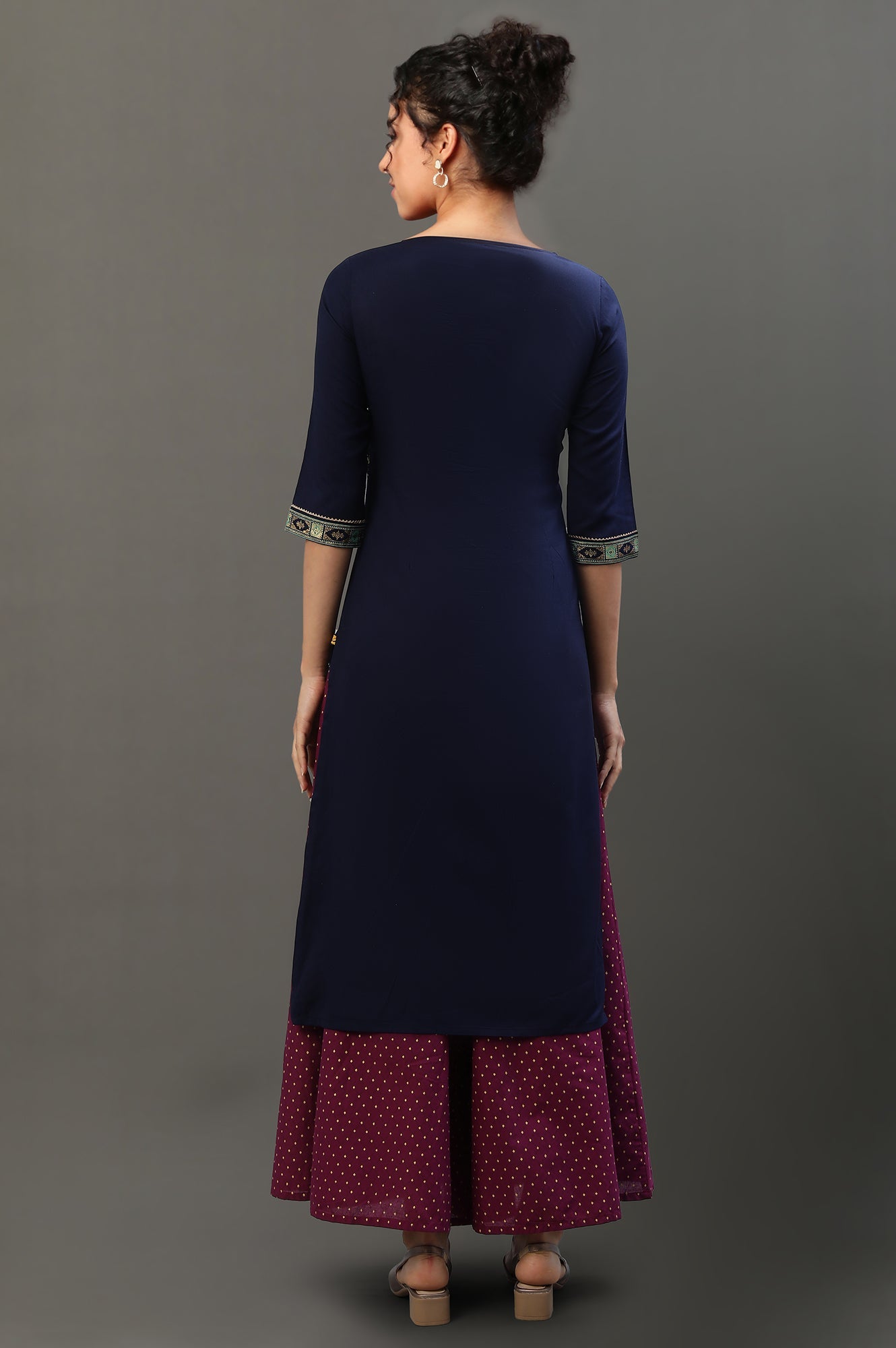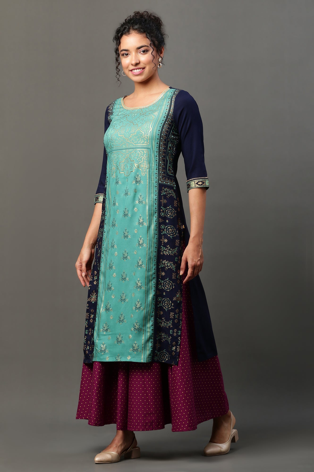 Our best seller silhouette of contrast front panel is a no brainer for this season, this piece has been curated keeping in mind all the festivity and celebration around. Printed with gold foil and heavy lace patch around neck makes this a perfect fit for your wardrobe.
