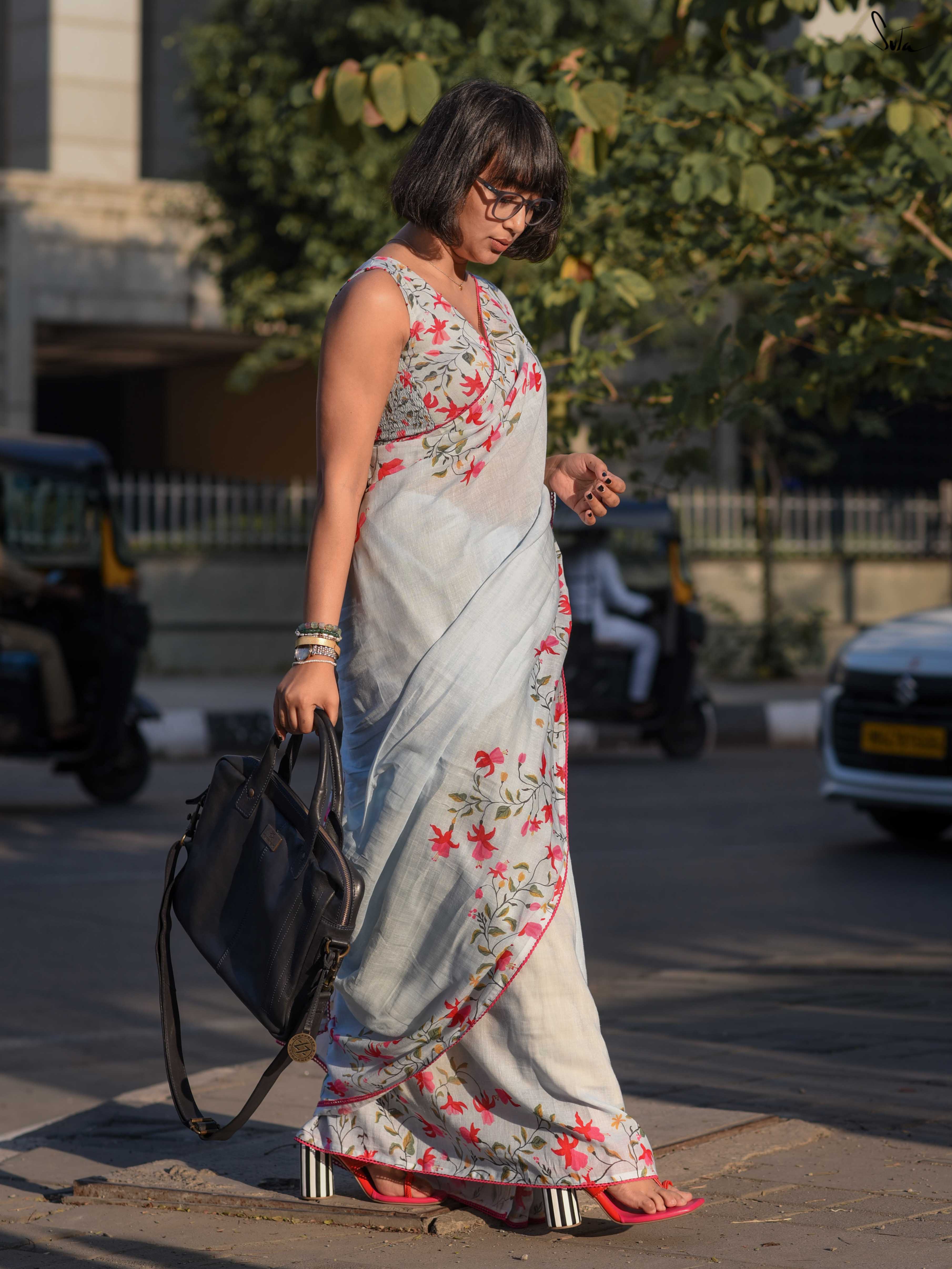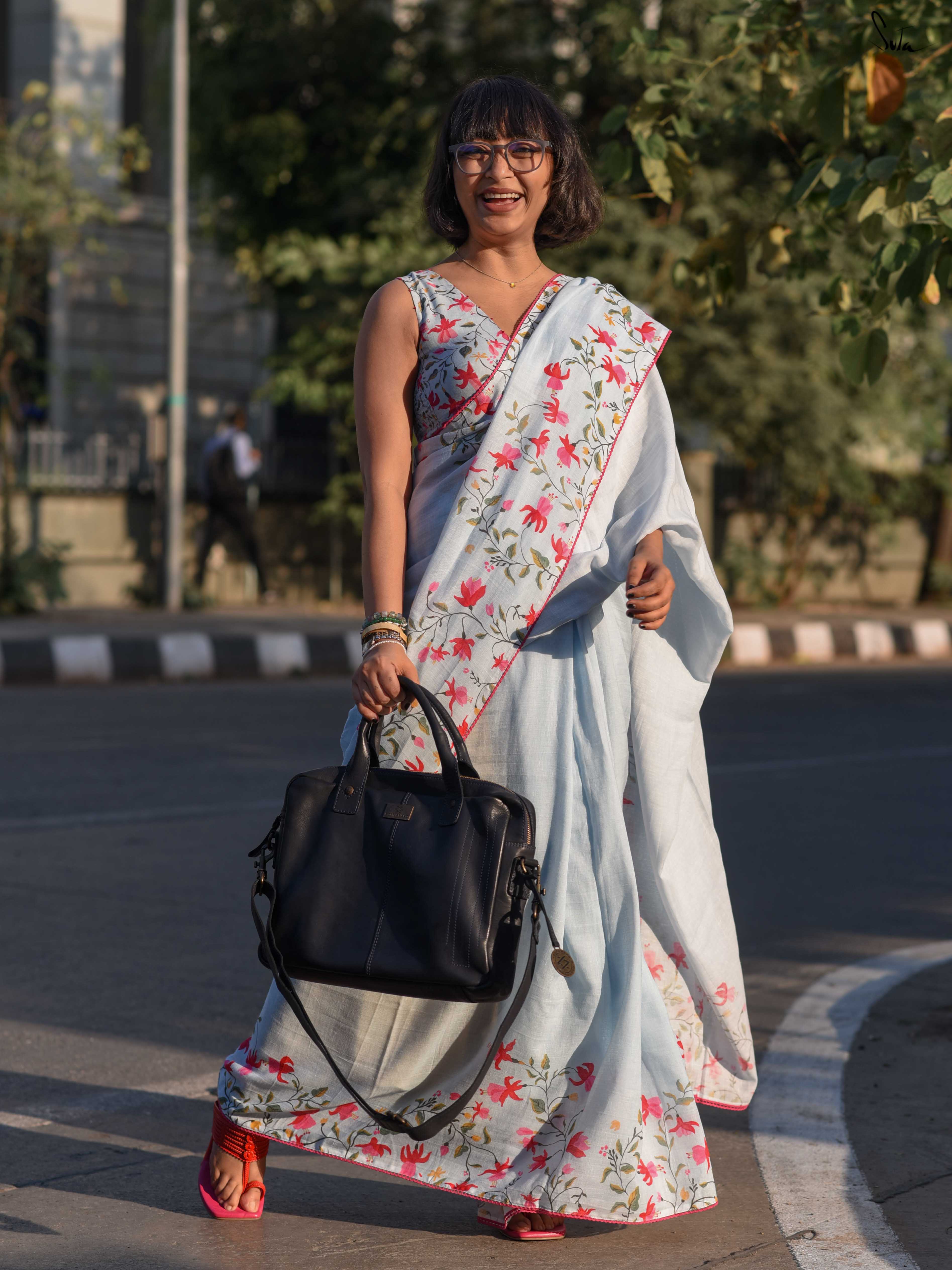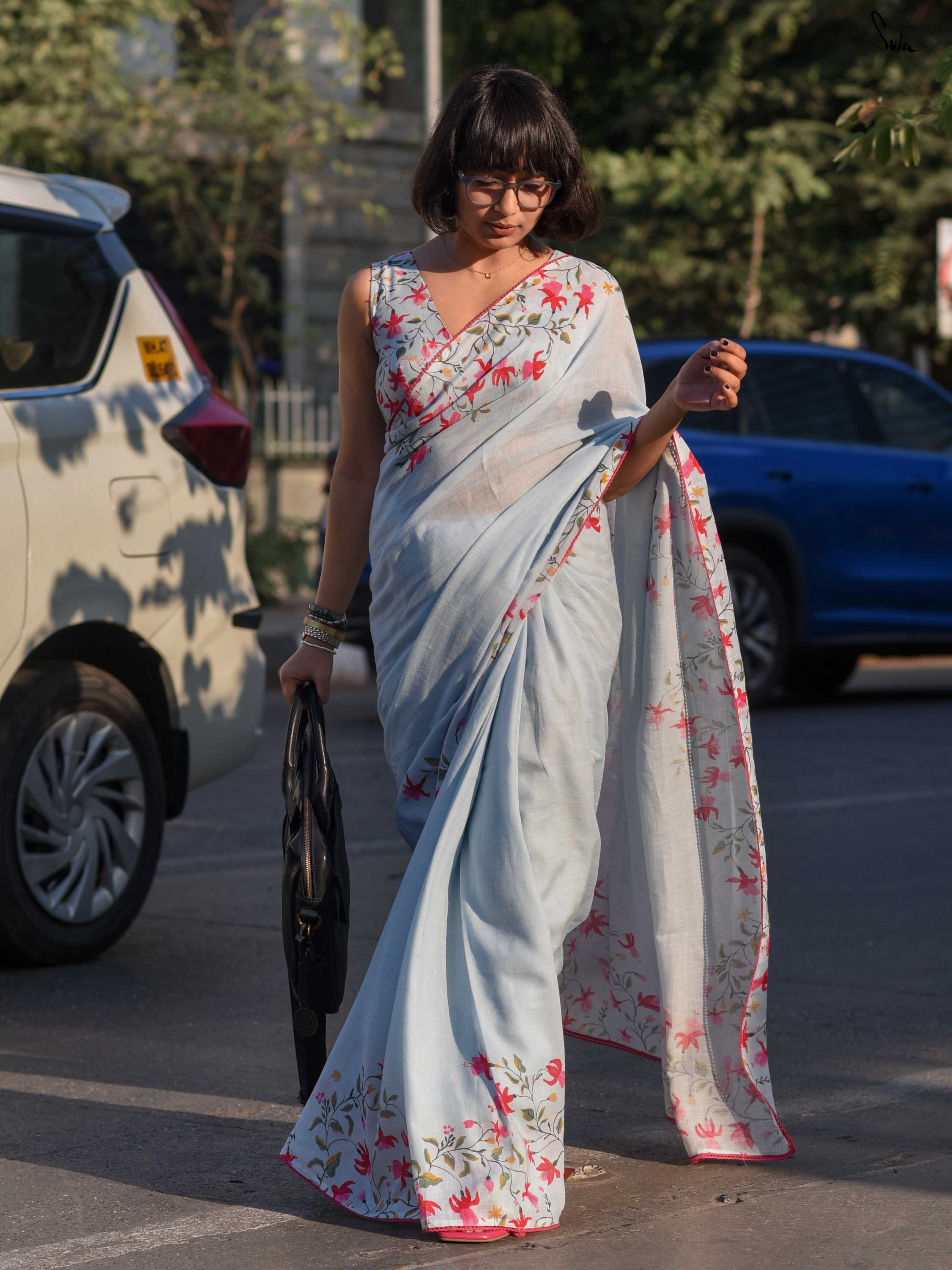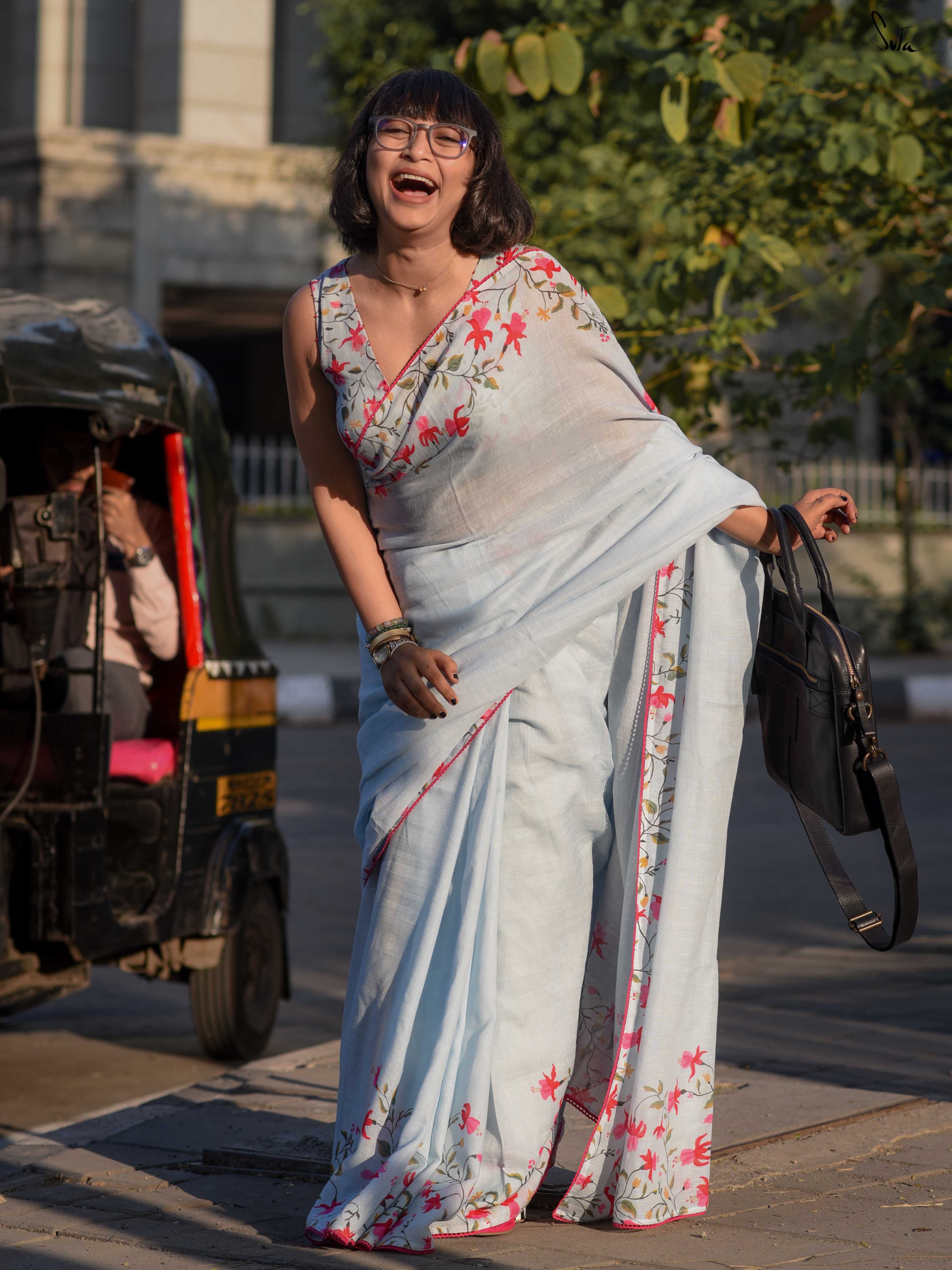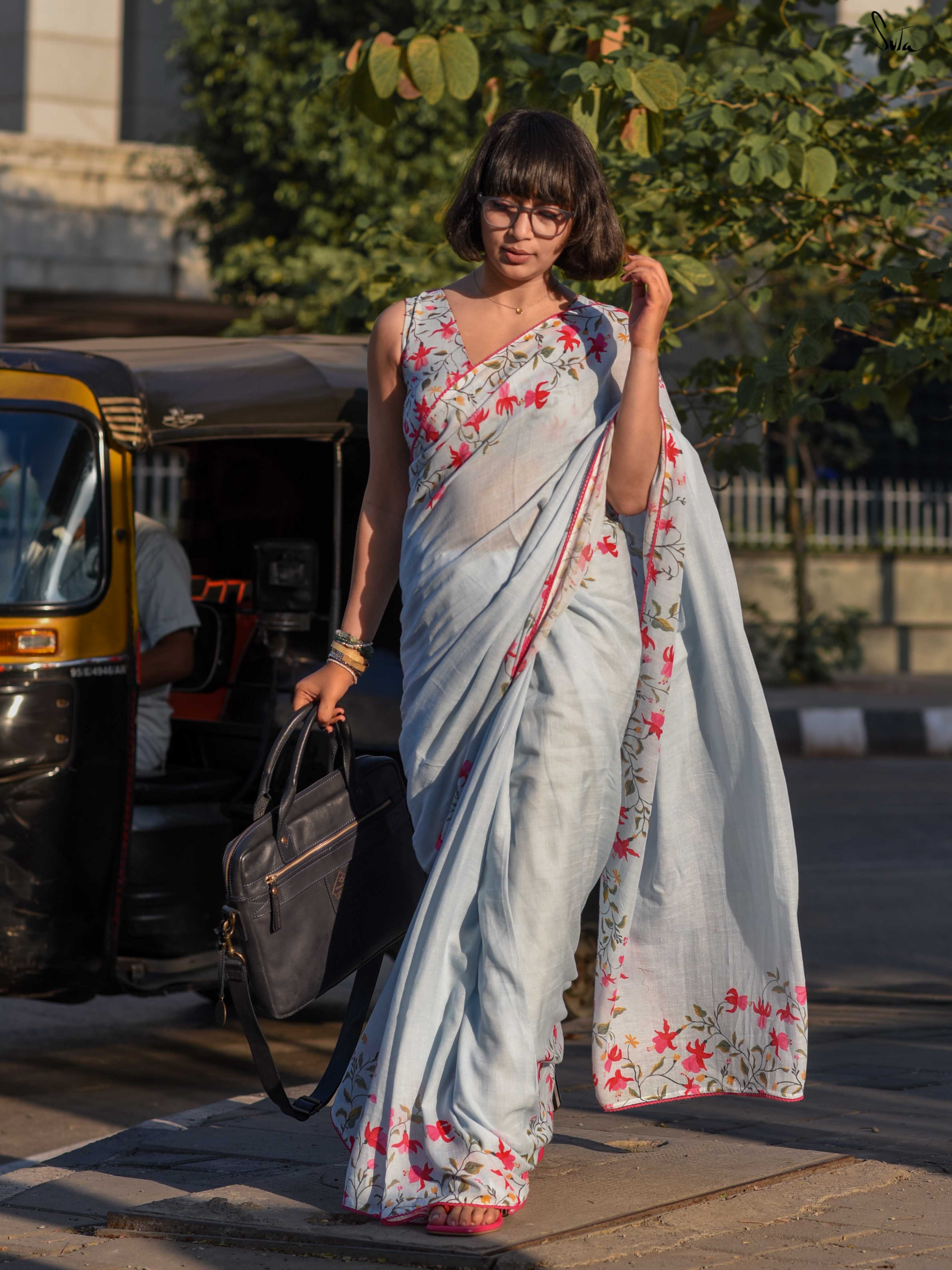 A fresh blue base saree designed for easy, everyday wear. Made from a soft cotton-linen blend, this saree is breathable, lightweight, and comfortable enough to carry through long workdays.