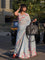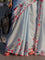 The saree features digital floral prints inspired by fuchsia flowers, adding a soft contrast to the blue base. Delicate pink lace detailing along the border brings in a subtle pop of colour, keeping the look balanced and wearable.