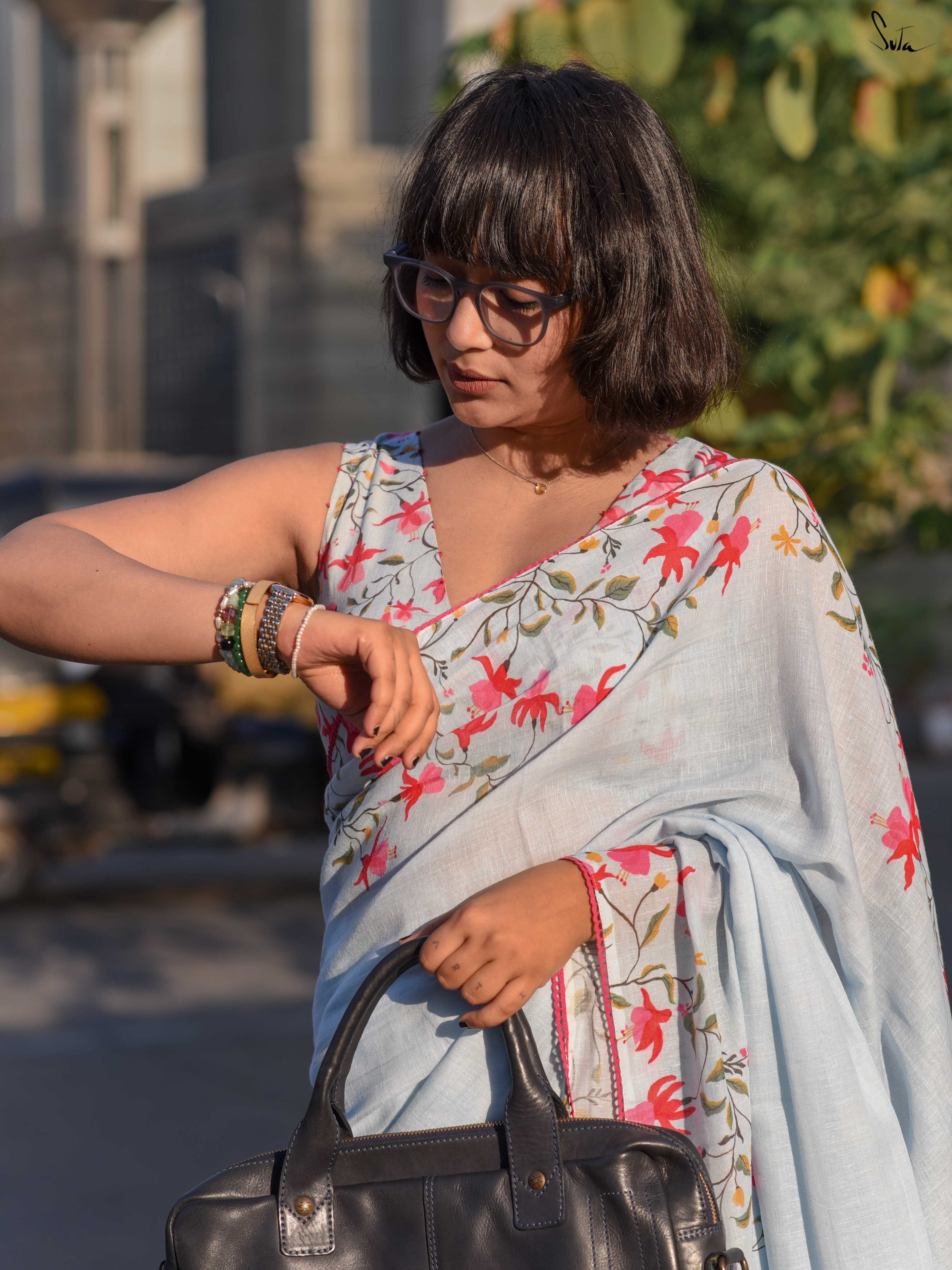 She drapes the saree absentmindedly, the cotton-linen light against her skin. Fuchsia florals appear gently, never interrupting the calm, just adding colour where it’s needed. Pink lace follows the edge like a quiet reassurance.