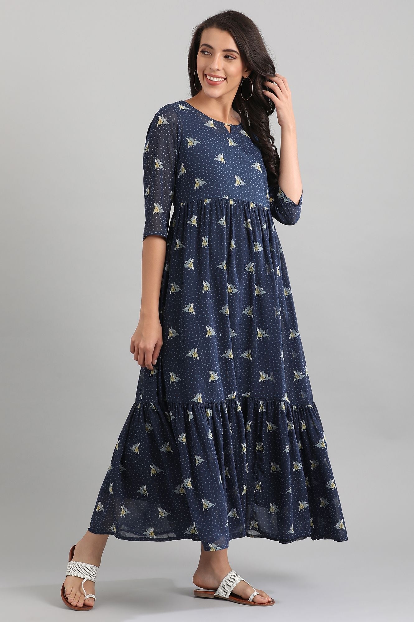 Blue gathered dress in round neck with V and 3/4th sleeves.