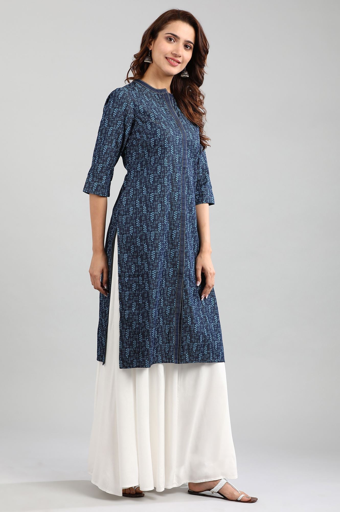Blue mandarin neck kurta with printed detail and placket on the front.