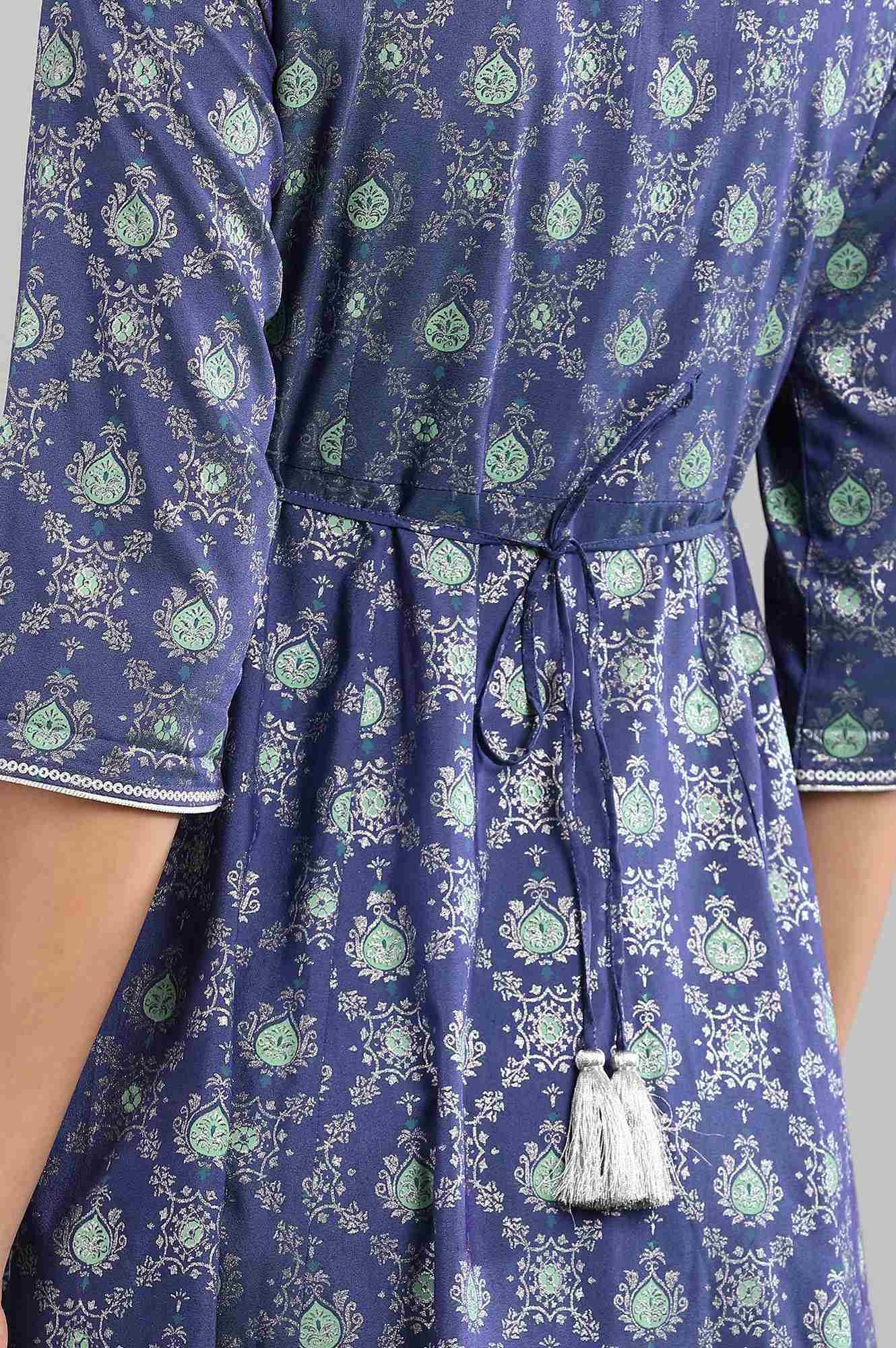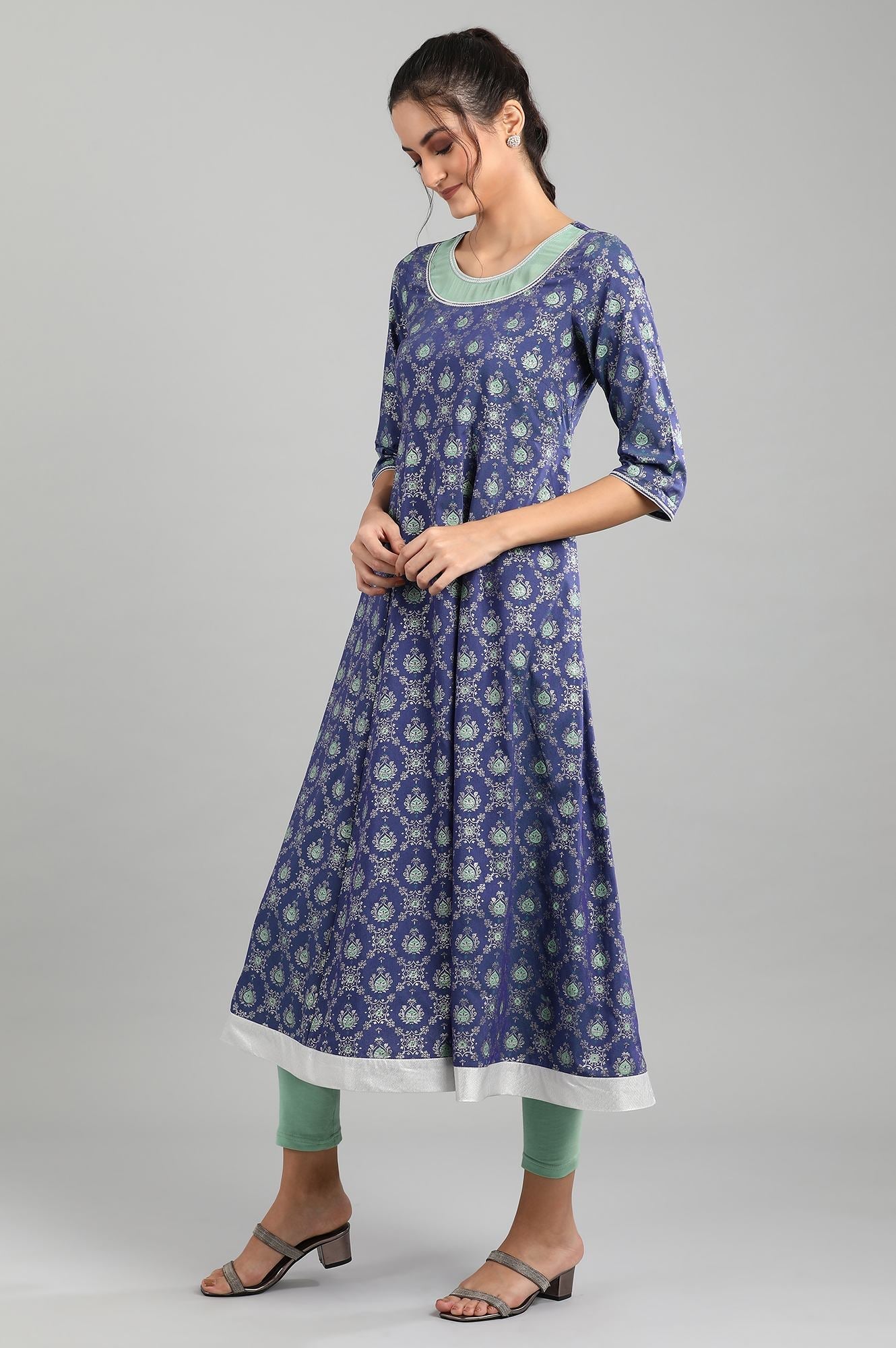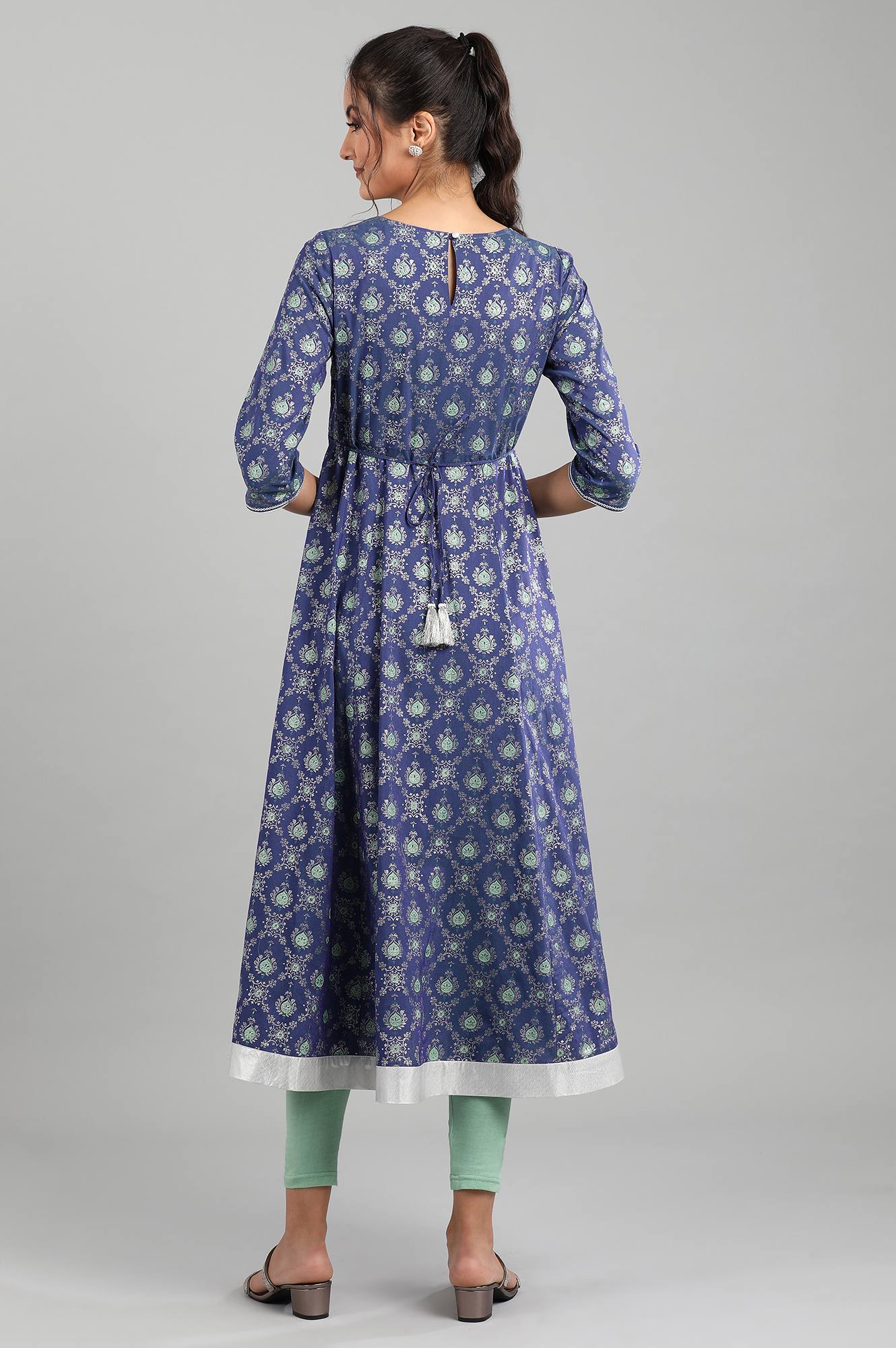 This blue round neck 3/4 sleeve ankle-length kurta has printed detail, flared hem and border detail around neck and hem.