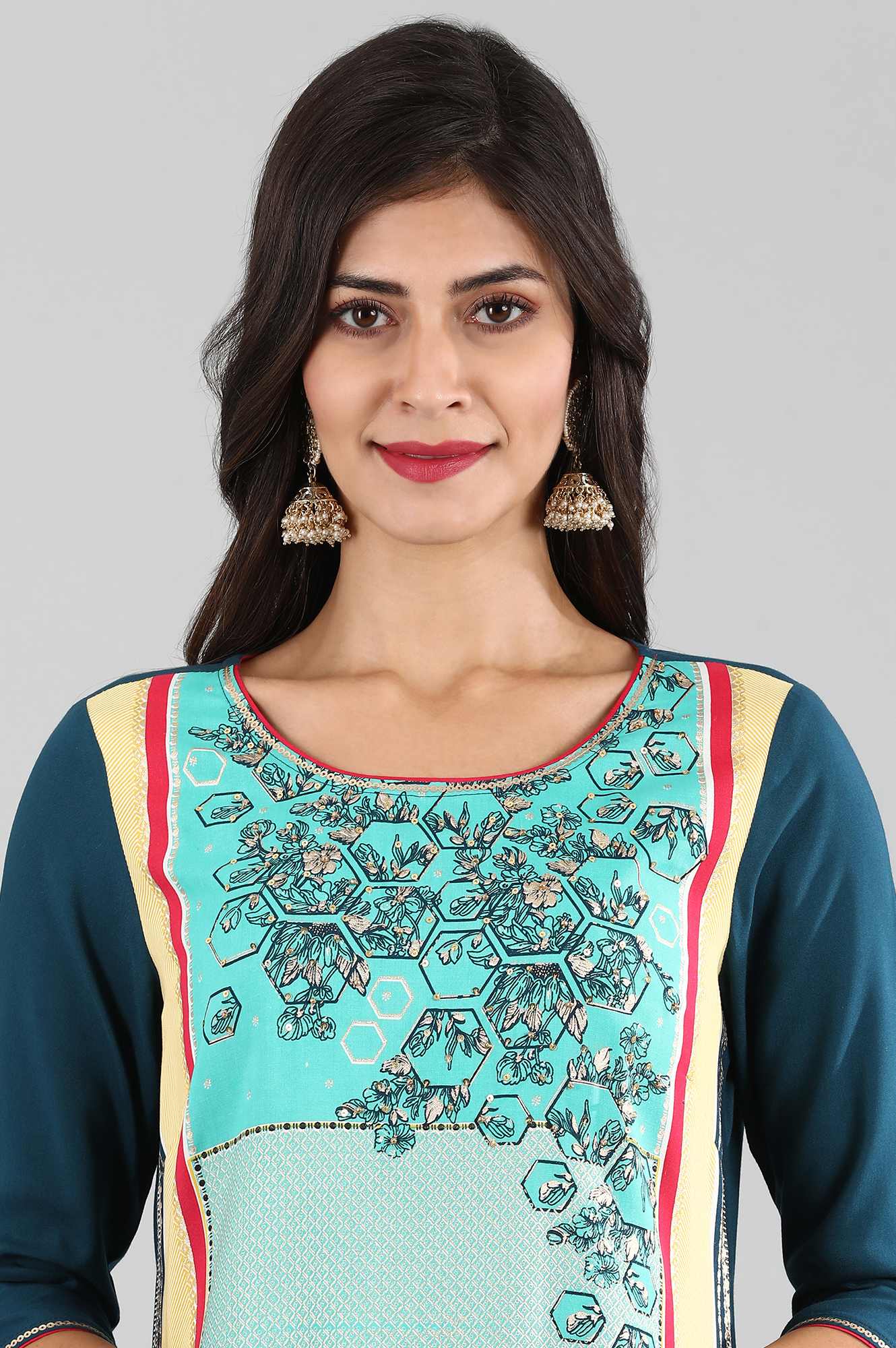 Blue round neck straight Liva kurta with animal print detail.