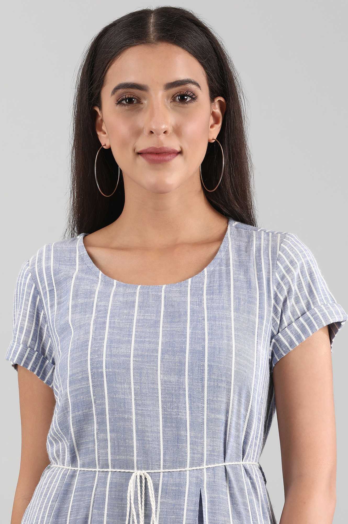 Blue A-line round neck Liva kurta with tie-up detail at waist and striped pattern all-over.