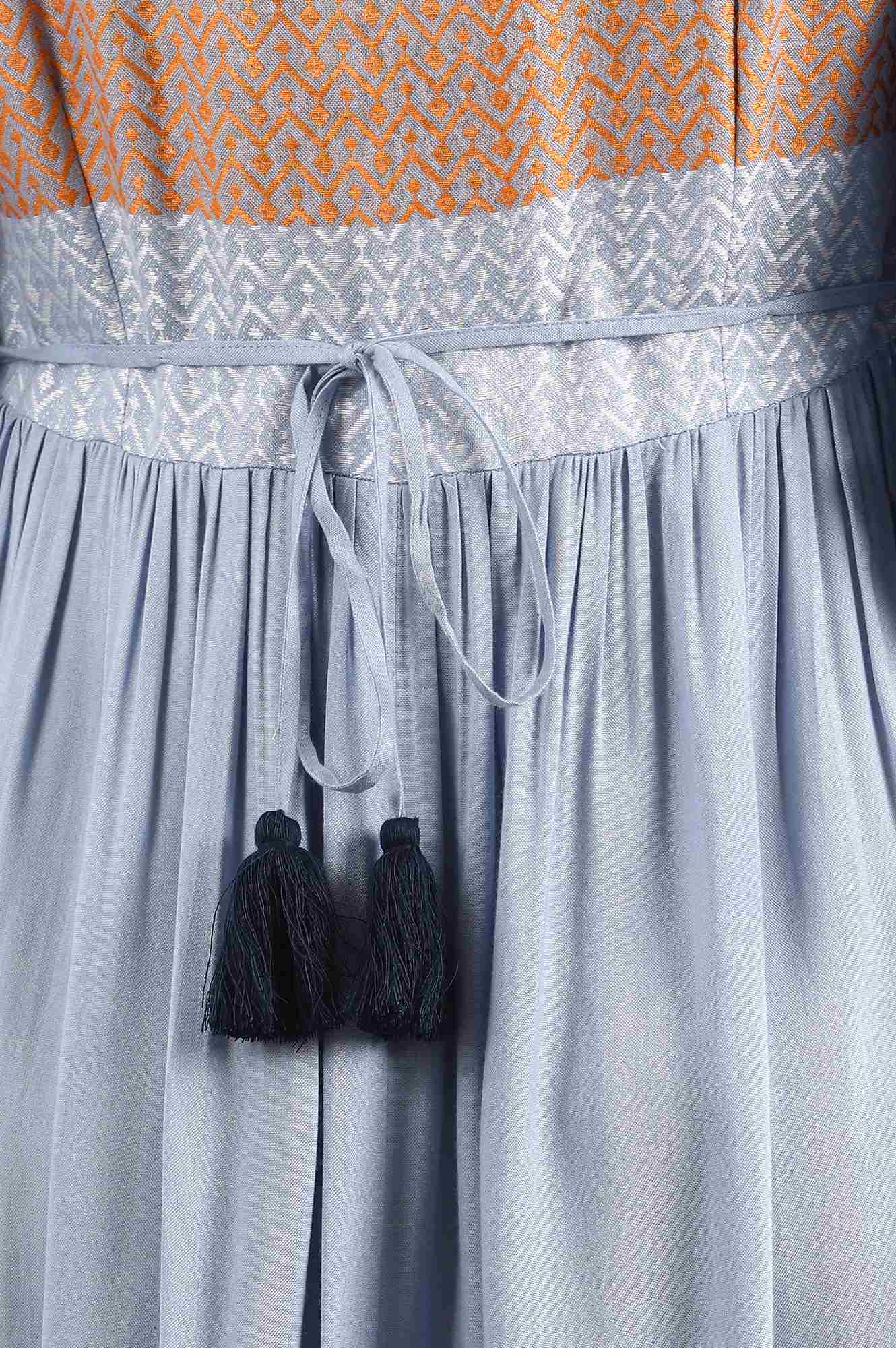 Blue round neck yarn-dyed Liva dress with gathers at the waist and mock placket on the front.