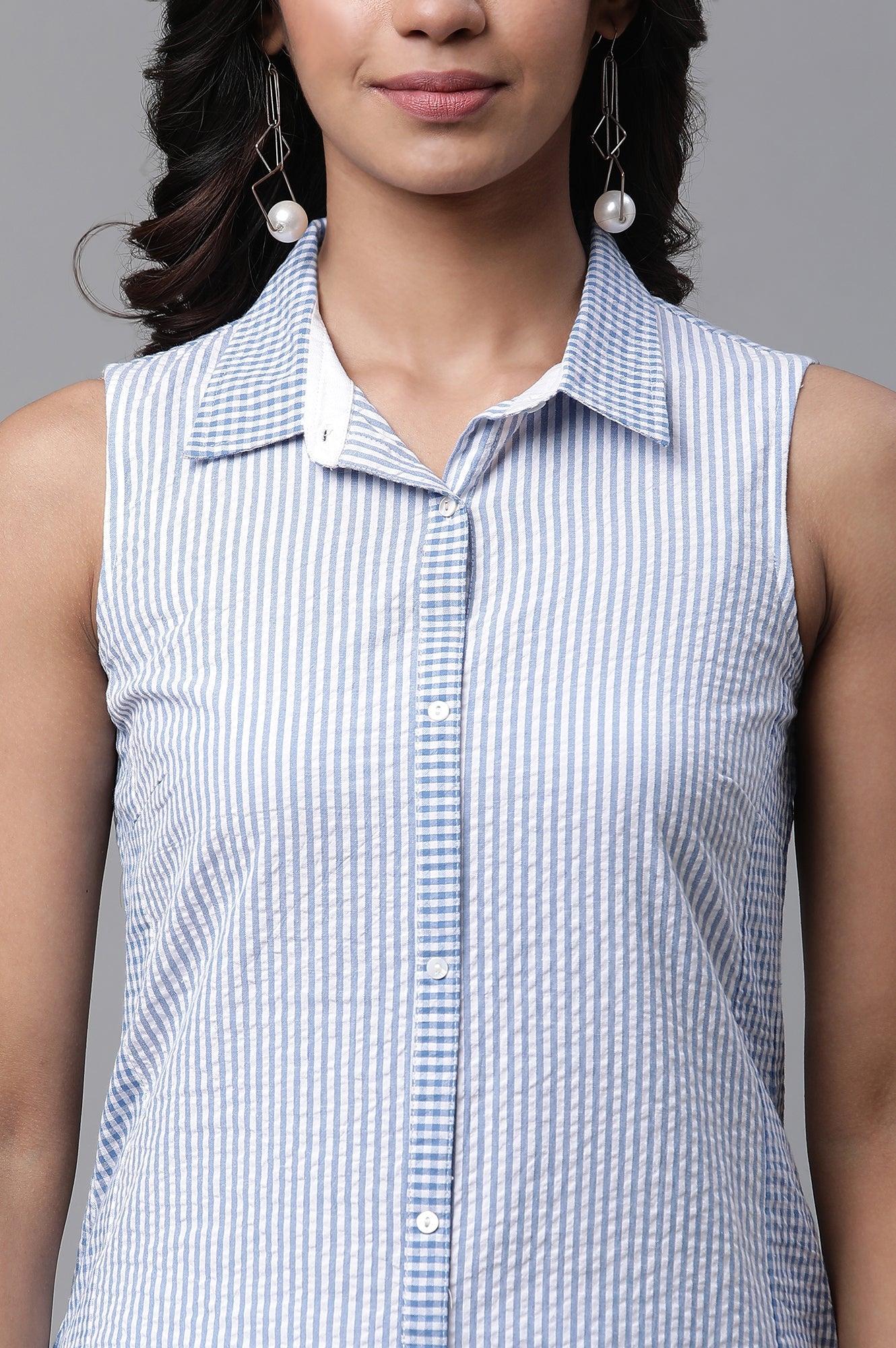 Accentuate your everyday look with this textured seer sucker fabric short kurti. It has been elevated with checks play on side panel which gives this a very fresh look. This Aurelia top-wear is highlighted with shirt collor and sleeveless style.
