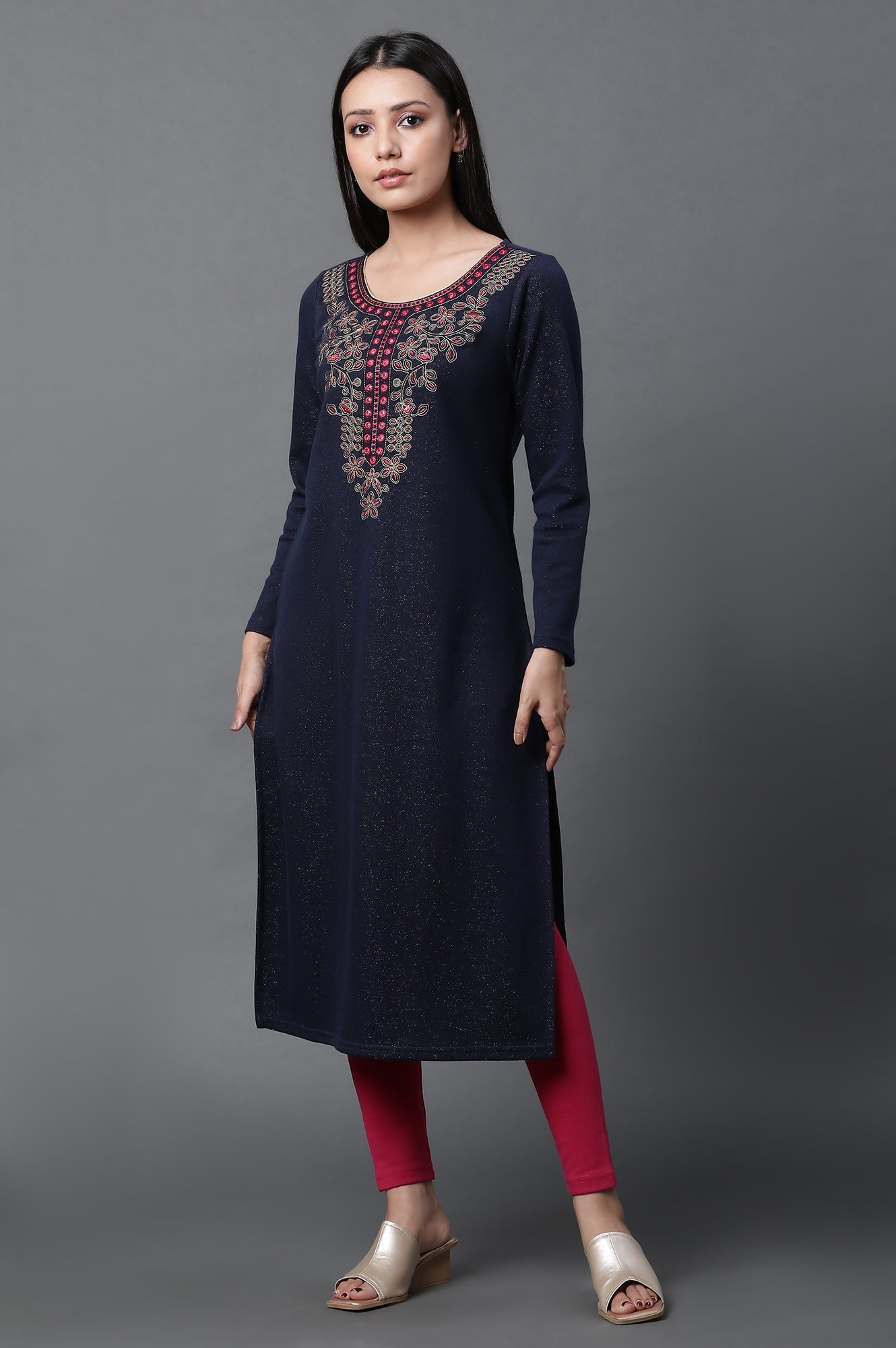 Introducing our stunning warm jacquard kurta set to make you feel cozy and fashionable. With a touch of gold woven into the fabric, it exudes an elegant and regal vibe. The bold chunky embroidery adds a striking and stylish element to the overall design. Whether you're attending a festive occasion or a wedding, this kurta will make you stand out effortlessly. Embrace warmth, comfort, and impeccable style with this kurta set. The set also has contrasting pink winter tights.