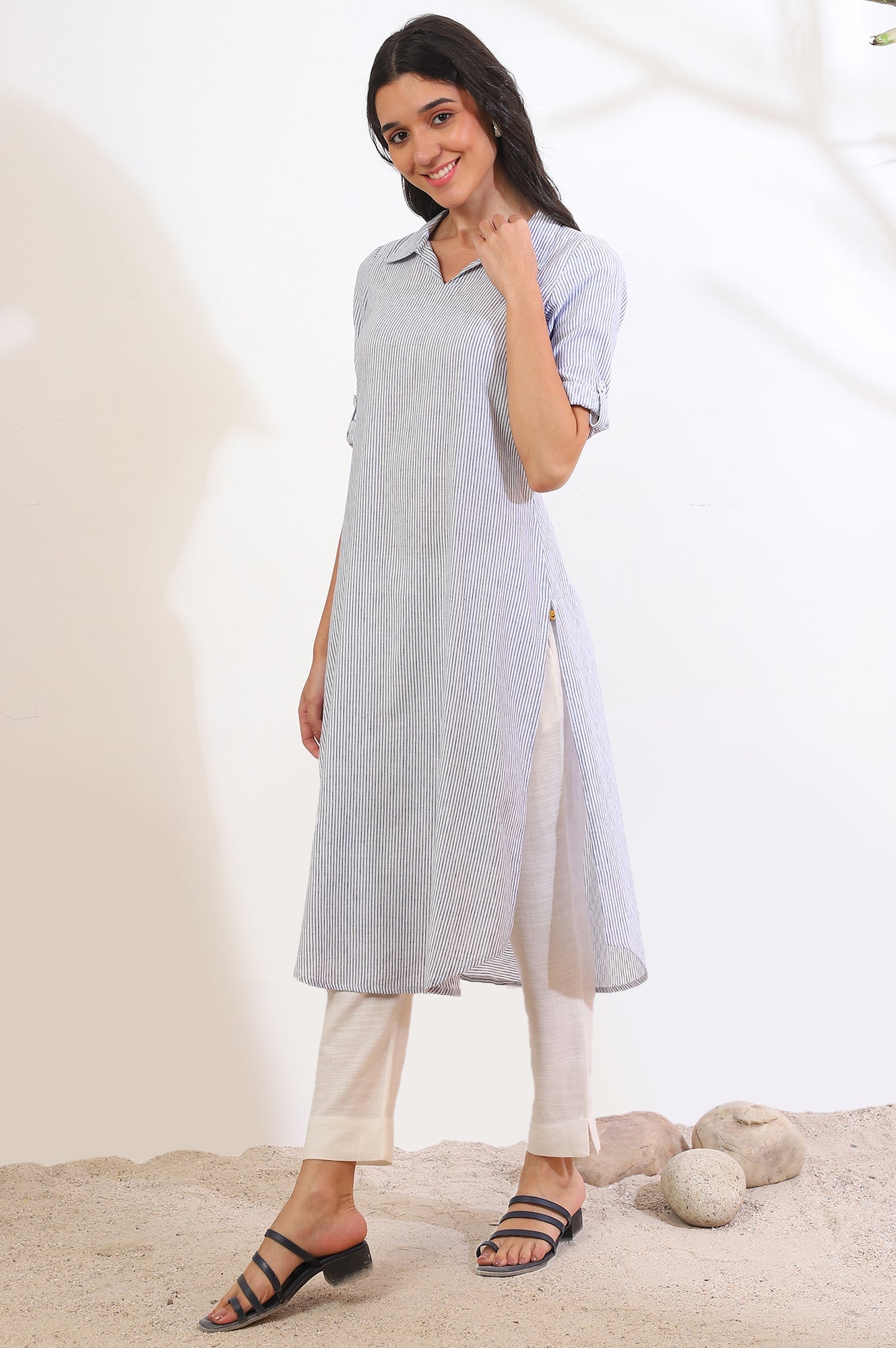 Blue Yarn Dyed Straight Cotton Flax Kurta