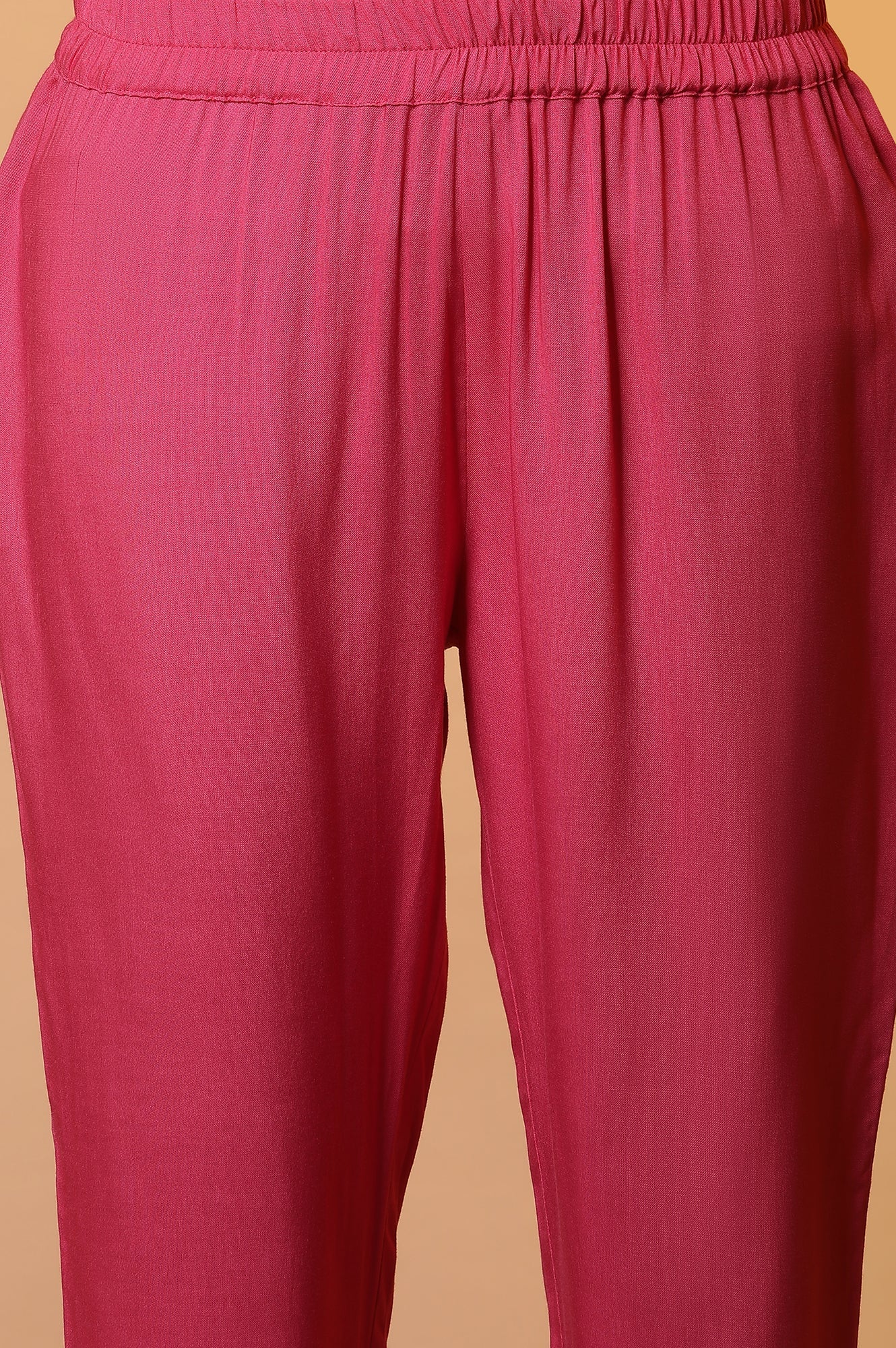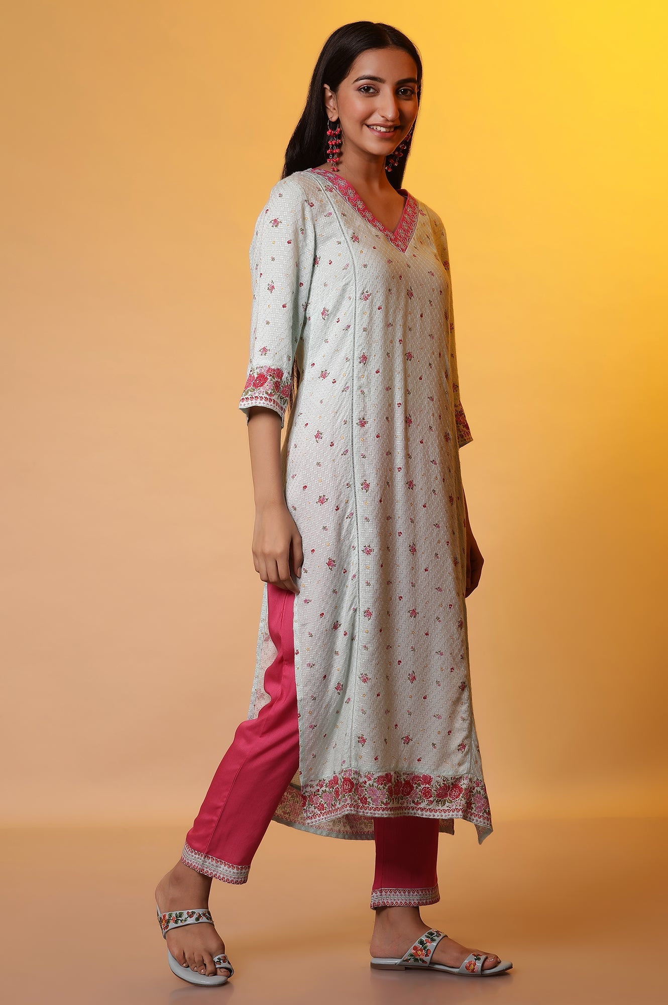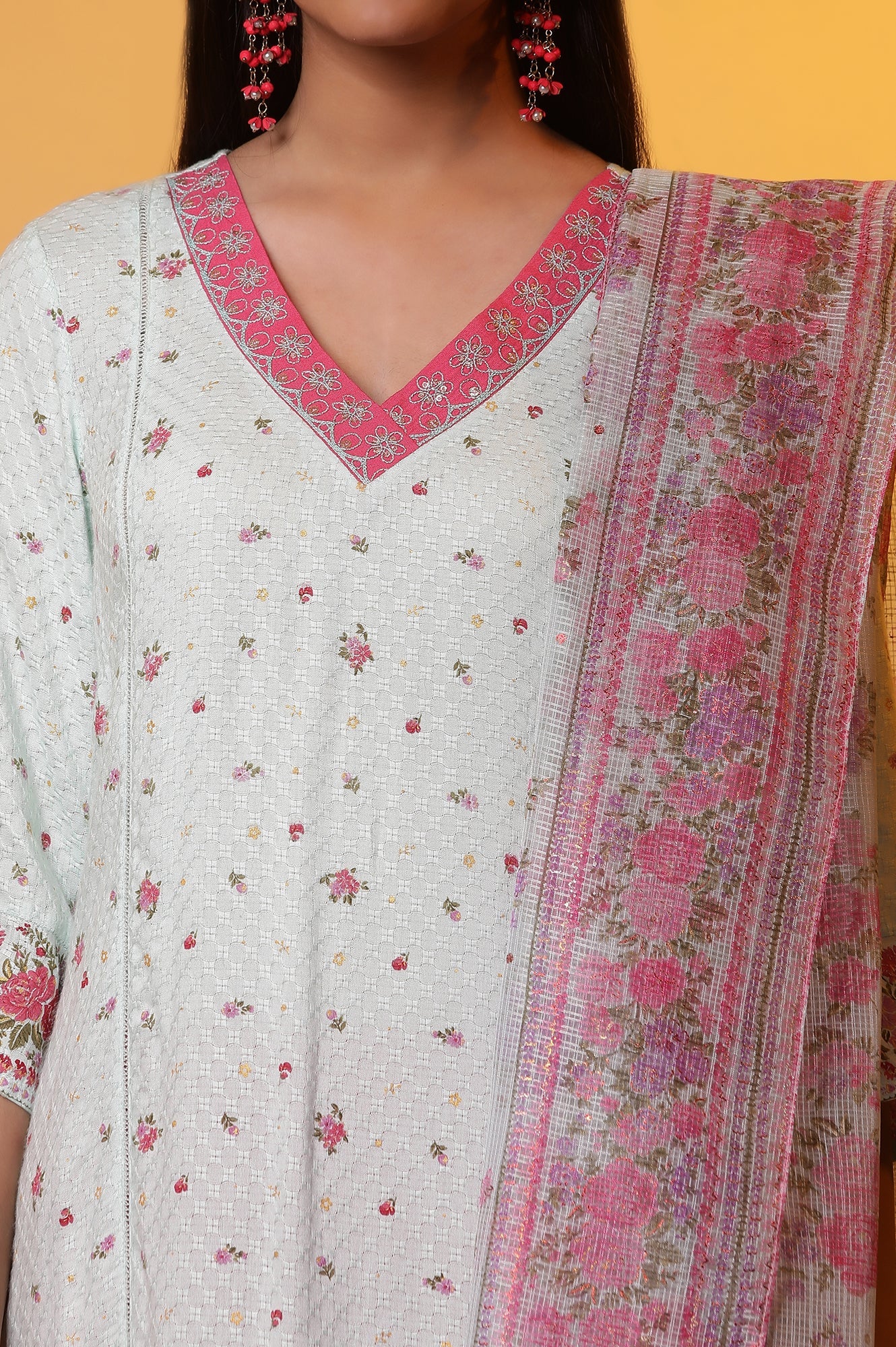 A beautiful straight printed kurta set featuring multi-coloured floral print. The shading technique in print adds a premiumness to its look. It also has stylised embroidered neckline, which makes the set a perfect choice for day event. It comes with pink pants having border at hemline and kota dupatta.