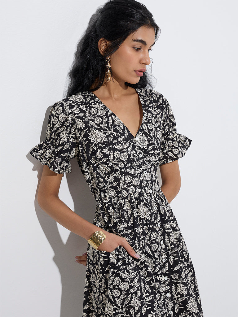 This black dress by Bombay Paisley boasts floral prints throughout on an A-line silhouette. Spun from pure cotton, it features a V-neck and puff sleeves, and is finished with convenient side pockets.