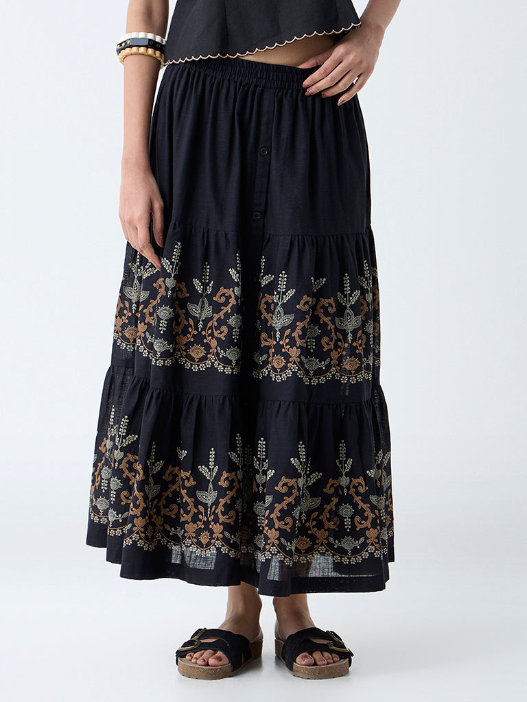 Shaped in a tiered silhouette, this black skirt from Bombay Paisley is detailed with floral motifs for added charm. Milled from a sumptuous fabric for all-day comfort, it is fitted with an elasticated waistband to ensure ease of wear.