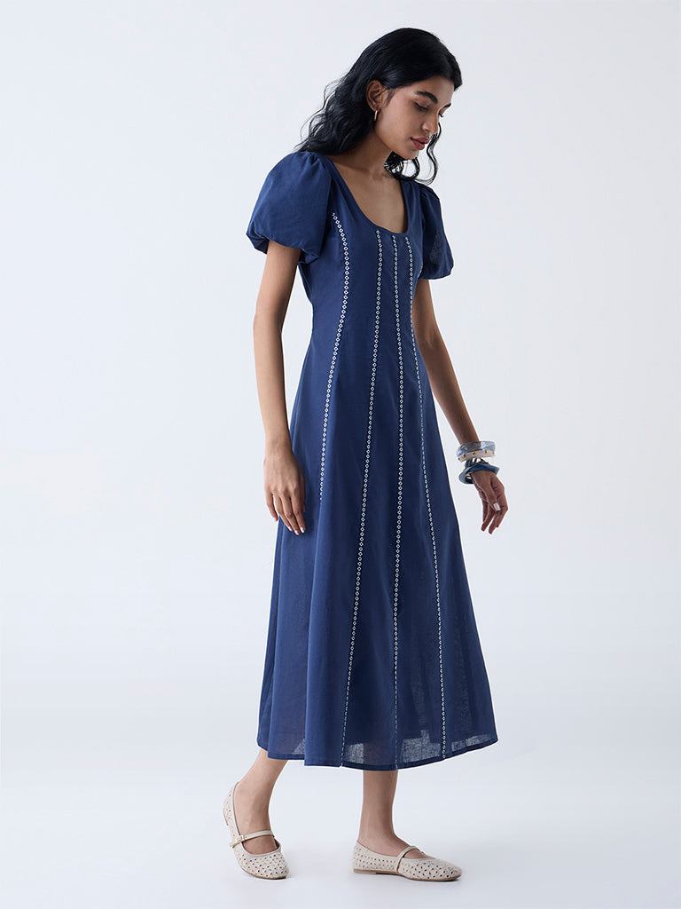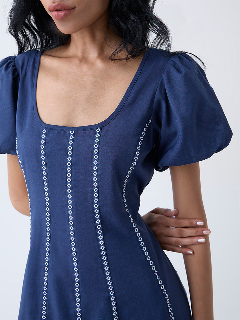 There’s a laid-back grace to this blue dress from Bombay Paisley. Fine stripes lend a quiet rhythm to the A-line silhouette, shaped with a scoop neck and soft puff sleeves that refine the upper frame. Cut in a cotton-blend fabric that moves with ease, it offers a gentle, unhurried flow.