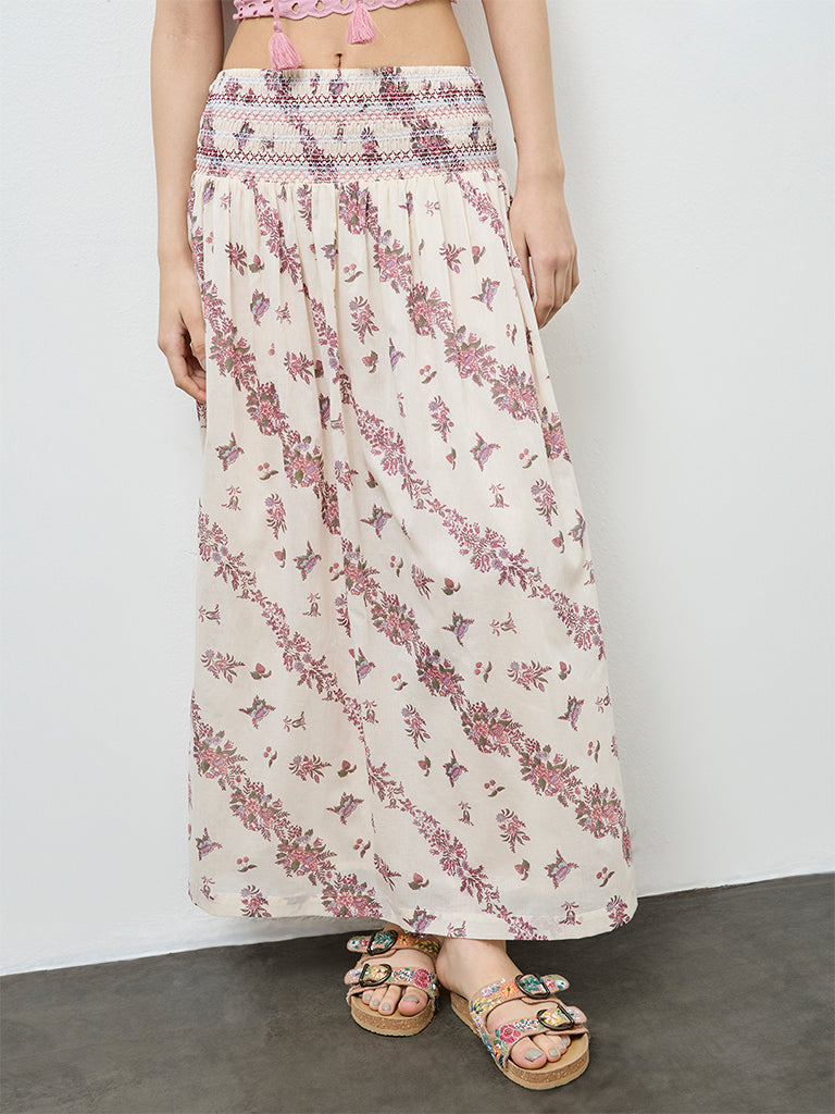 Pack versatile charm into your vacation wardrobe with this off-white skirt from Bombay Paisley, patterned with floral motifs throughout. Spun from a cotton-rich fabric, it is designed with a smocked waistband that offers a comfortable fit.