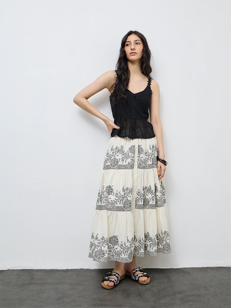 Flowing with effortless movement, this off-white skirt from Bombay Paisley is shaped for relaxed everyday wear. The high-rise silhouette falls into a tiered structure, detailed with floral prints that add definition through the length. A button-down detail along the front enhances the design while the breathable cotton fabric delivers comfort for warm days and casual outings.