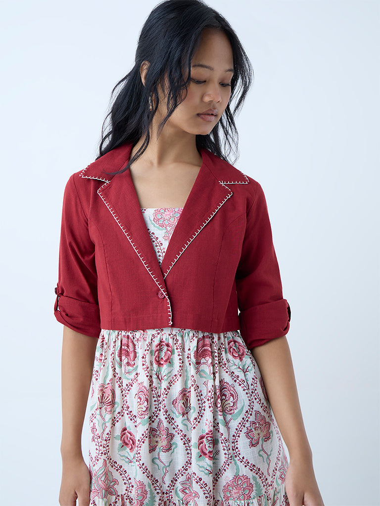 This red dress from Bombay Paisley captures an easy-going yet graceful vibe with its tiered silhouette and floral patterns. Cut from a cotton-rich fabric, it comes fitted with a square neck and adjustable shoulder straps, while the smocked back ensures a custom fit. The coordinated jacket is designed with a notched lapel and full sleeves, adding structure to the otherwise breezy ensemble.
