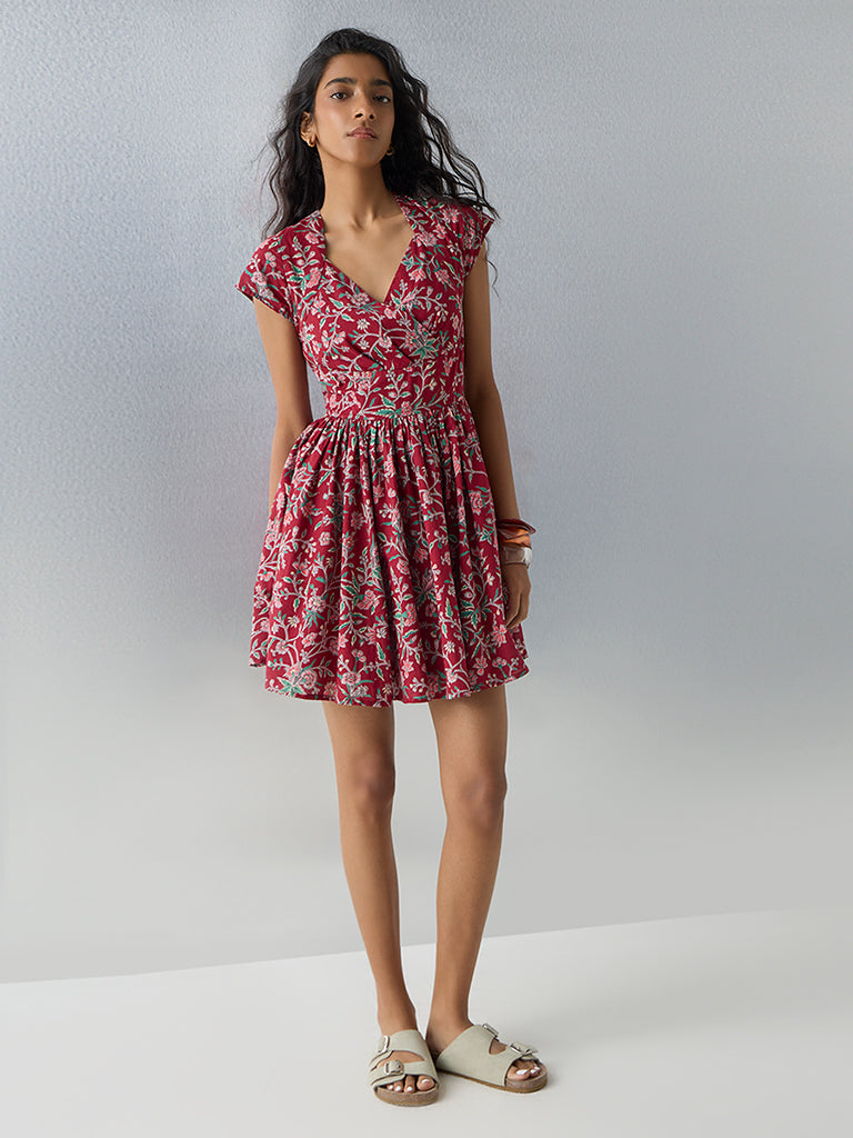 Make a statement with this red dress from Bombay Paisley. Featuring delicate floral prints, it is crafted with soft pleats that lend a flowing, graceful movement. Designed with a pentagon neckline, short sleeves, and handy side pockets, the dress is elevated by a cut-out back with smocked detailing, blending style and comfort for everyday wear.