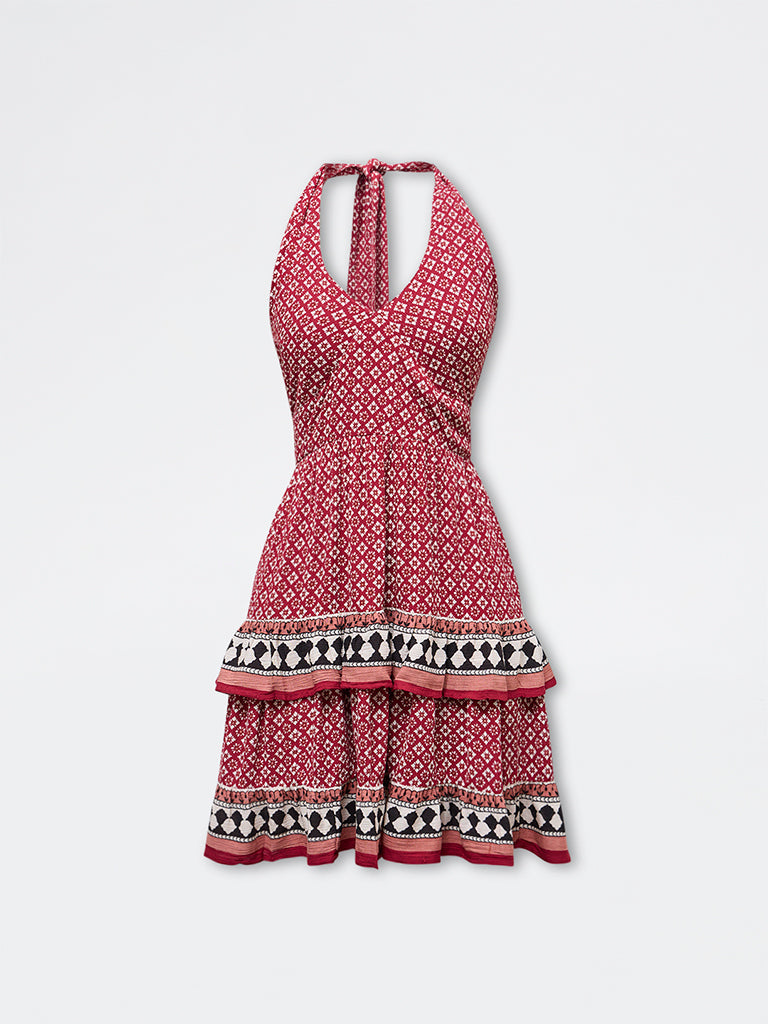 Bombay Paisley presents this red printed dress crafted from pure cotton for a light, breathable feel. The halter neckline is secured with a tie-round detailing, the neckline extends into a plunging V-shape framed by underbust stitching. Finished with a smocked back, an A-line silhouette and layered frills, it offers fluid movement and soft volume.