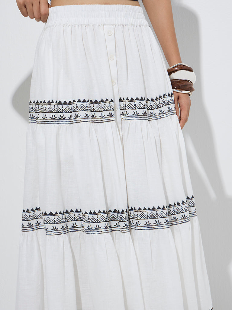 This white skirt from Bombay Paisley is decorated with printed detailing that lends a chic finish. Created from pure cotton in a breezy tiered silhouette, it features an elasticated waistband that ensures both comfort and a flattering fit.