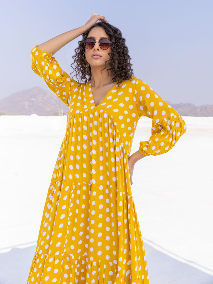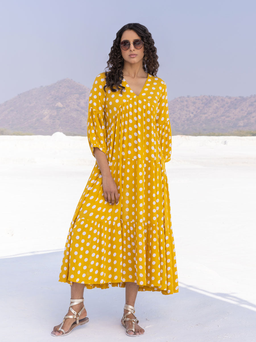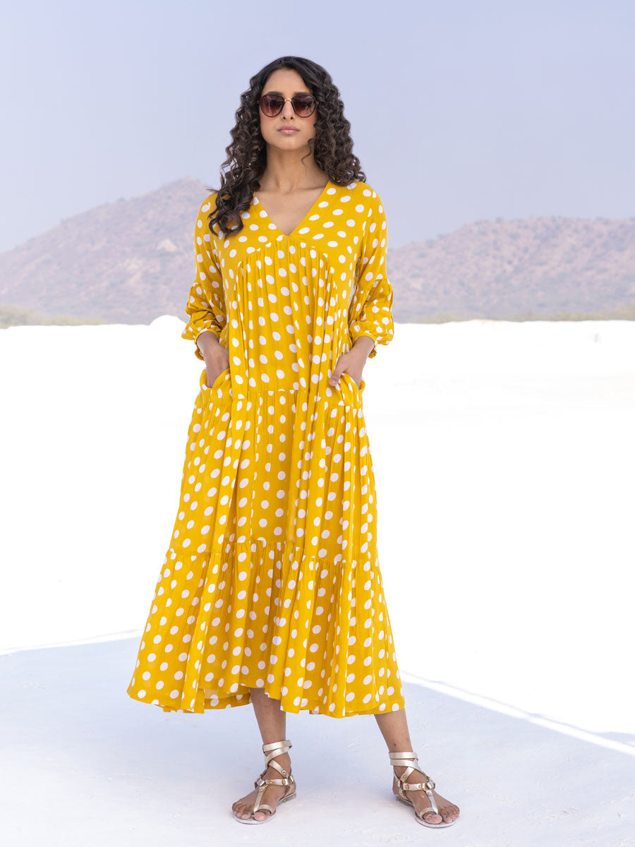 - Long maxi dress with a dense flare, a flattering neckline and comfortable sleeves