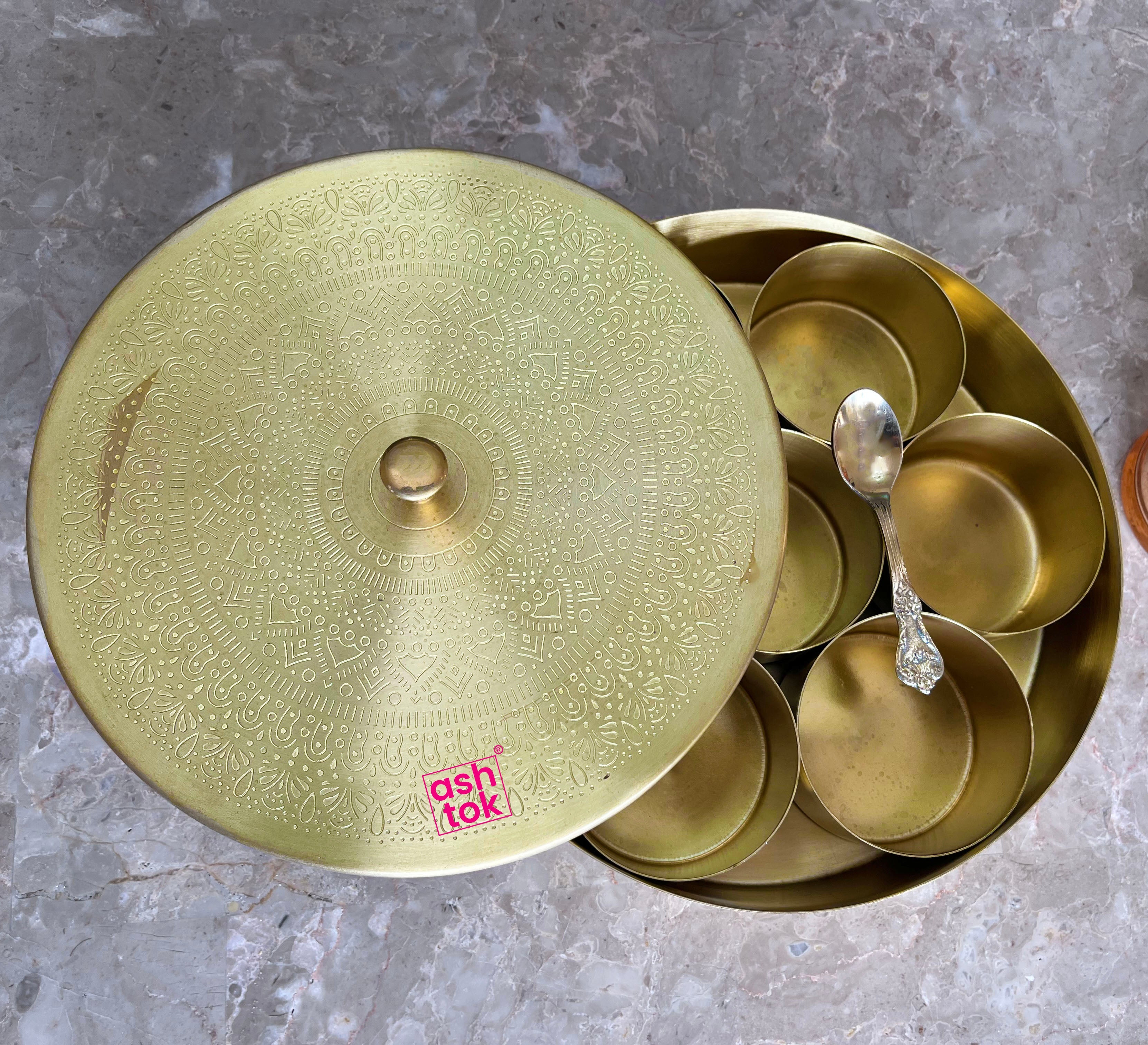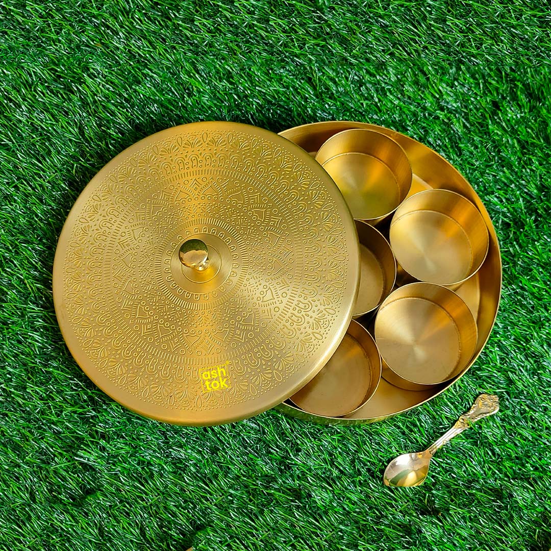 Package Contains: 1 Brass Masala Box Set with 7 Cups, Spoon, and Lid.