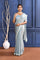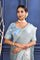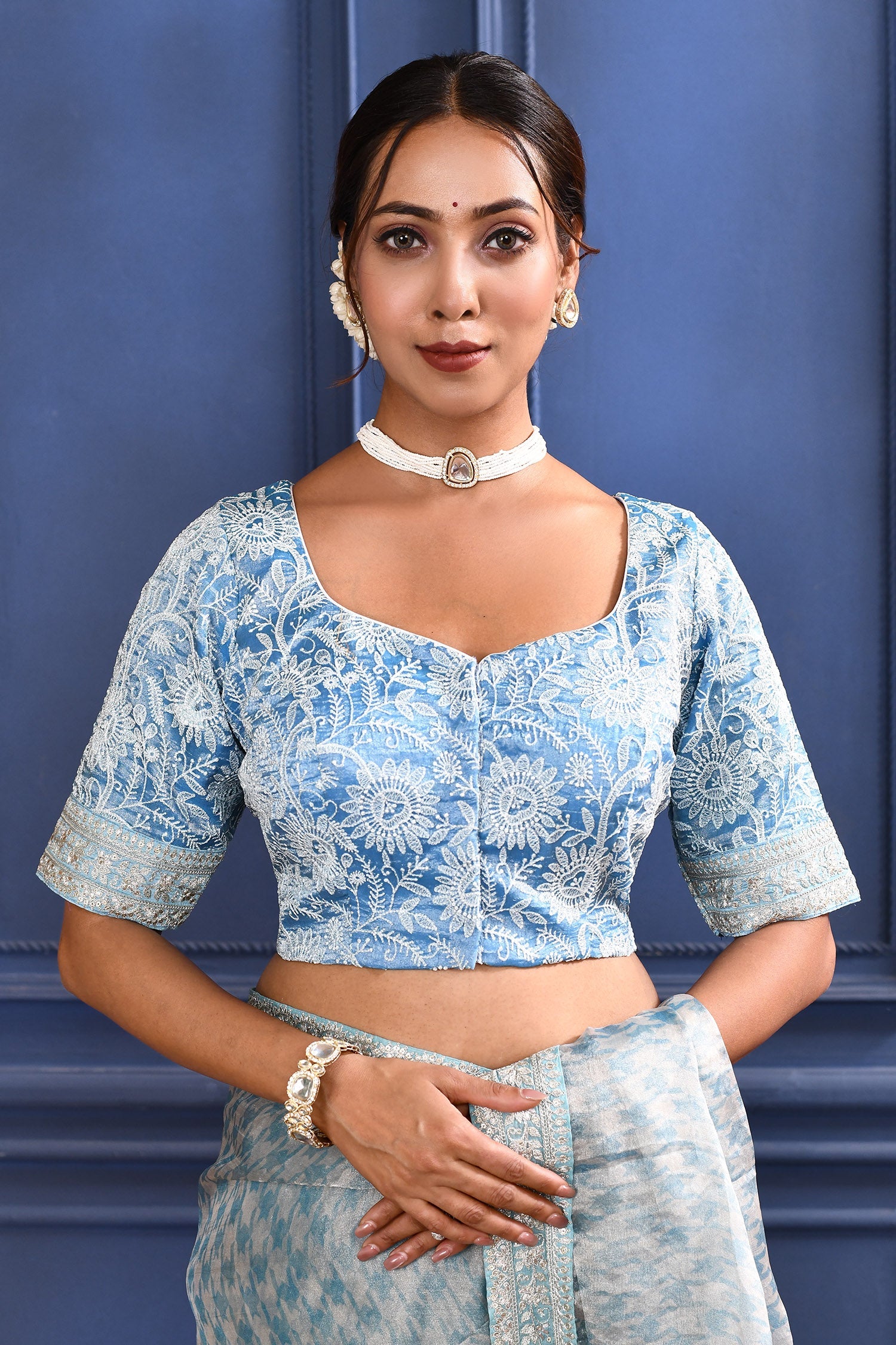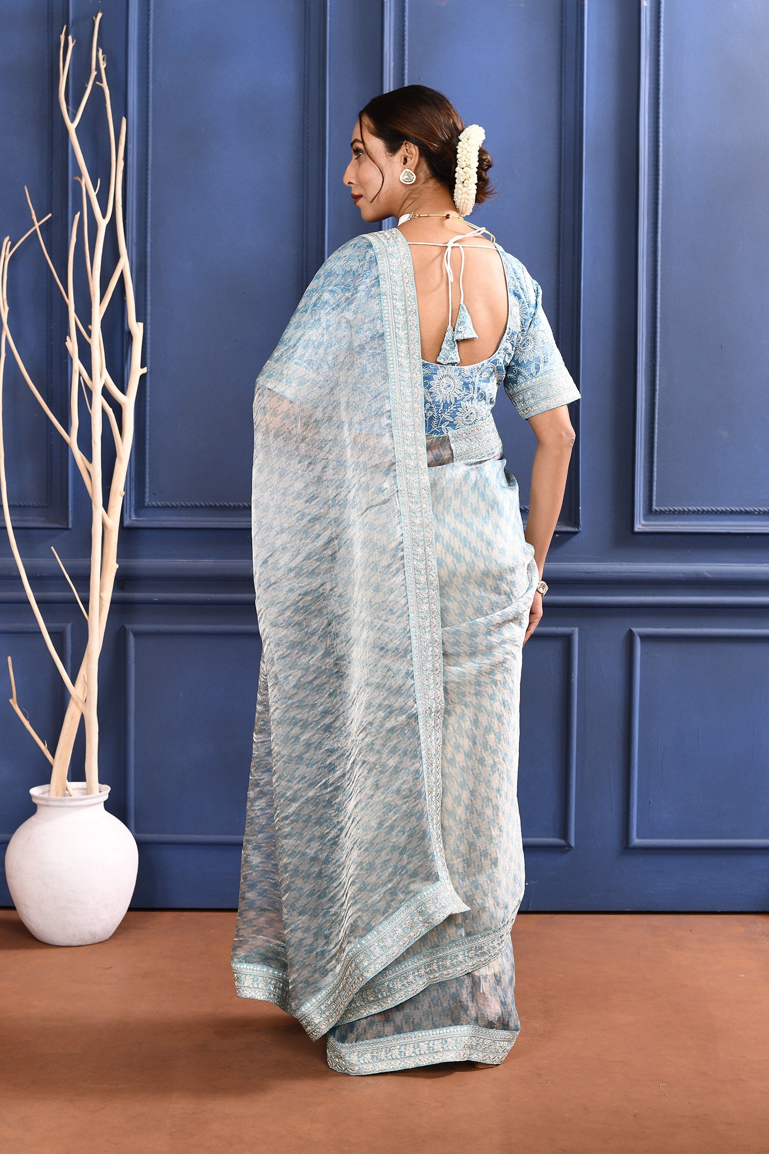 The bright blue printed tissue saree with embroidered self border and stitched blouse for a stunning look with traditional elegance.