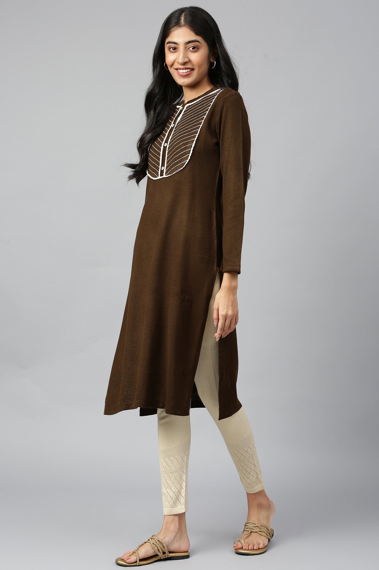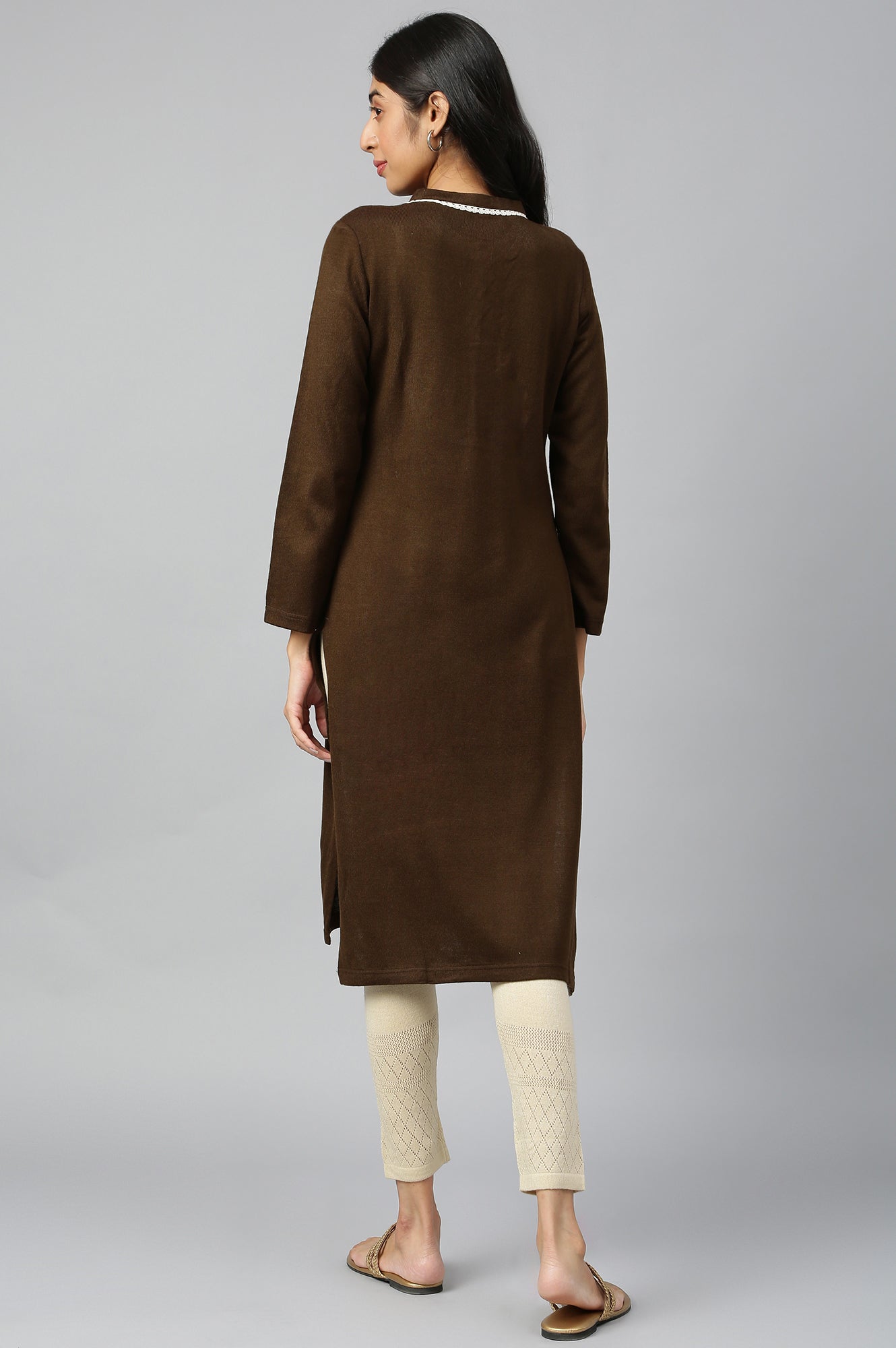 Turn Your Casual Look Into A Stylish One With This Knitted Chocolate kurta. It Has Band Collar With Button Placket And Features Thread Embroidery.