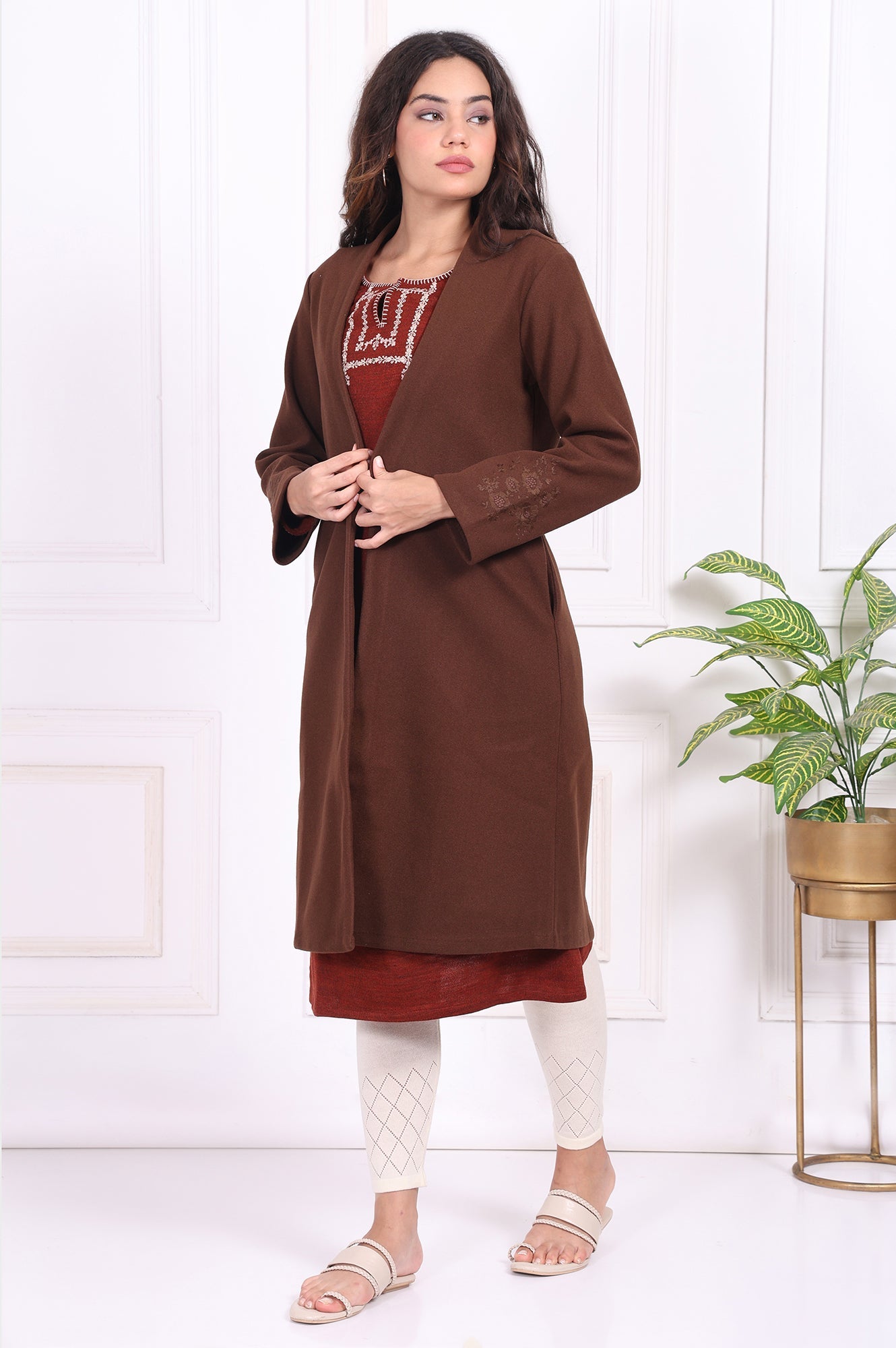 Chic and versatile, this brown solid straight coat for women is a winter wardrobe essential. The collarless design and embroidered sleeves add a touch of elegance, while the woven fabric ensures comfort and durability. Perfect for layering over ethnic or casual outfits, this longline coat is ideal for festive gatherings or casual outings. Its straight silhouette and dark brown shade make it a timeless addition to your collection. Whether you're dressing up for a special occasion or keeping it casual, this coat is your go-to choice for effortless sophistication.