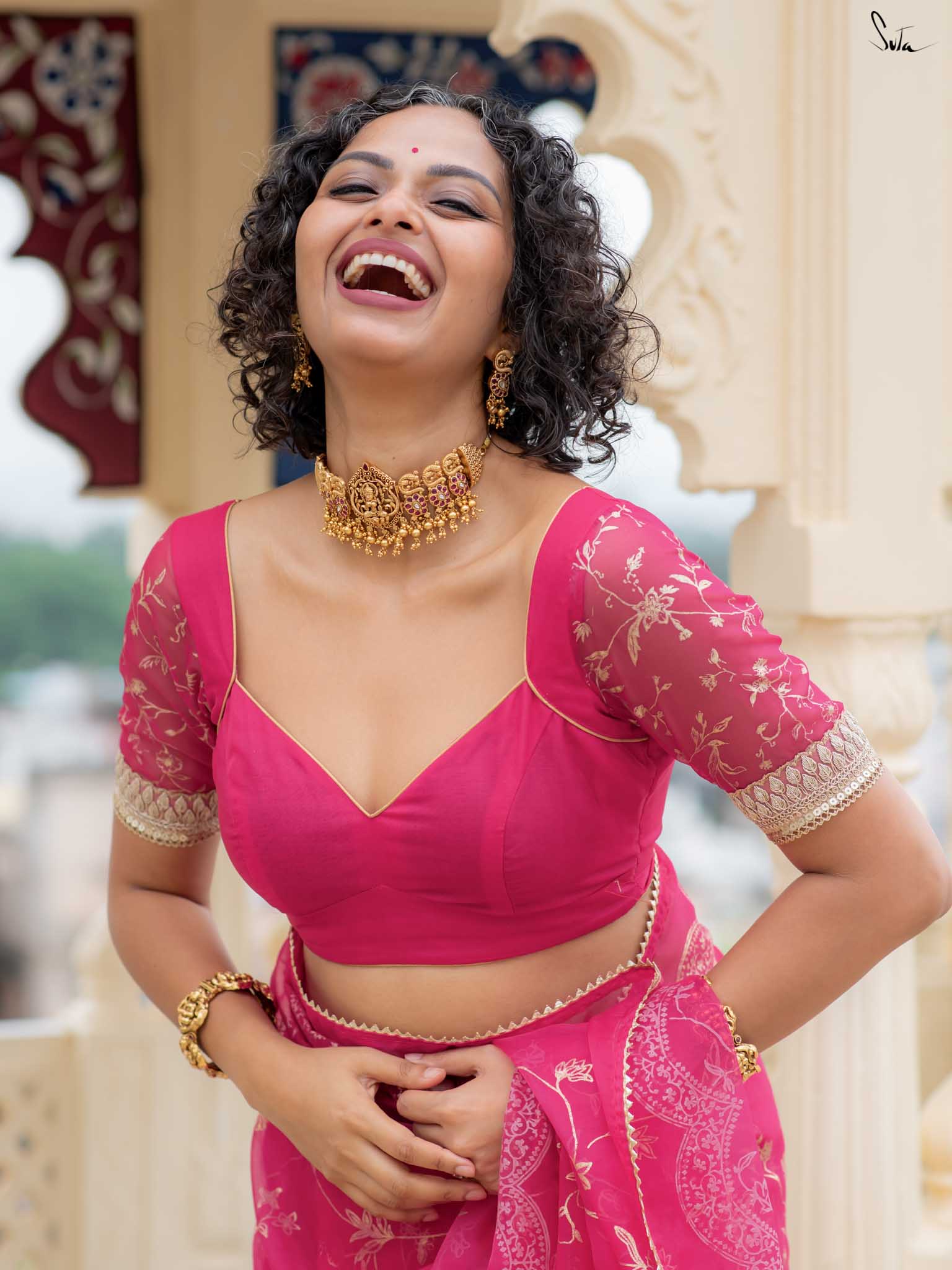 The model is wearing size S blouse and the saree is Gulabi Foil