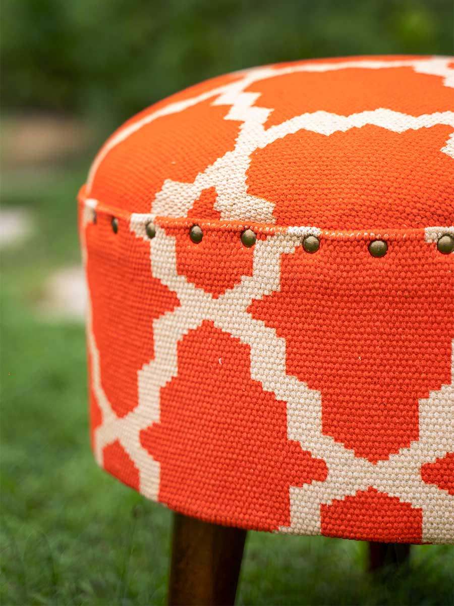 A beautiful combination of utility and design, our ottomans will find a fit in any space. Break the monotony of pastels and wood with a pop of color, and while at it, don't forget to marvel at the finesse and handcraft of each piece. Featuring solid wood legs and handloom rug upholstery.