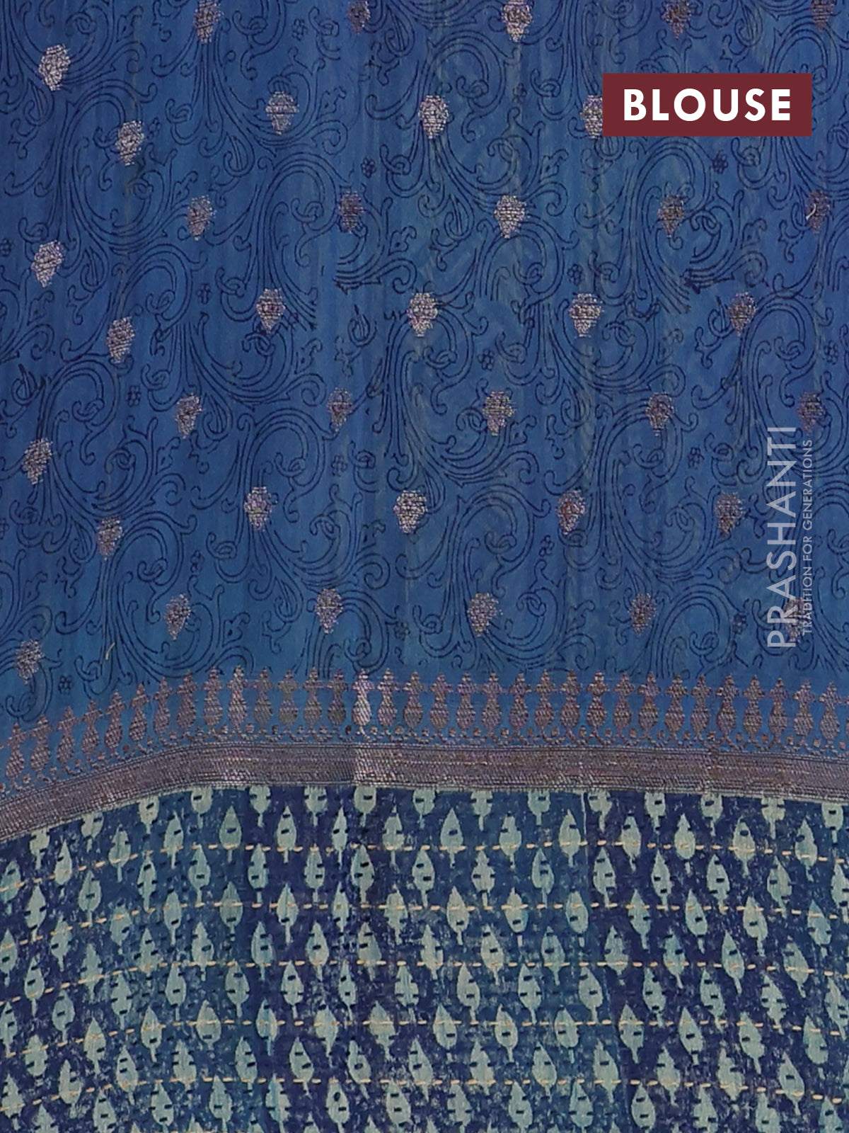 Chanderi silk cotton saree blue with allover prints & woven buttas and kanth stitch work border