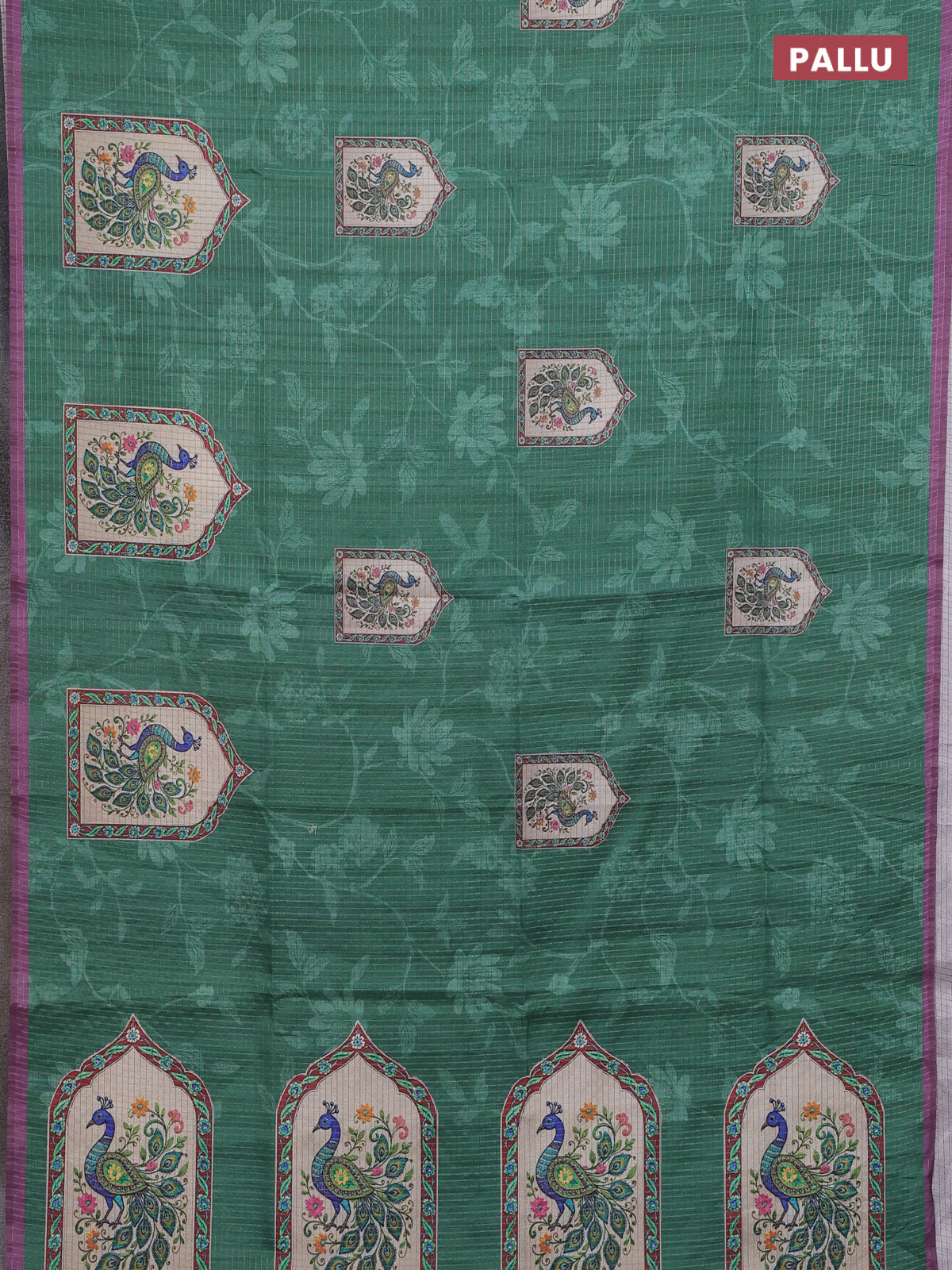 Chappa saree green and pastel purple with allover zari checked pattern & digital prints and printed pallu