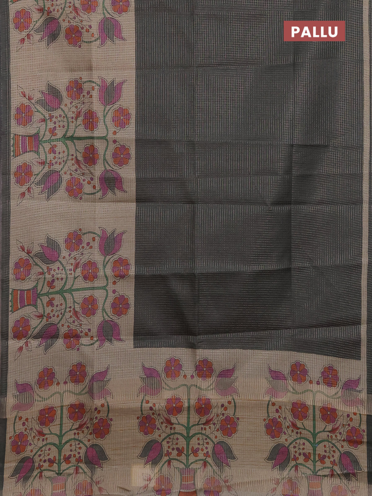 Chappa saree grey and beige with allover small zari checked pattern and floral digital printed pallu