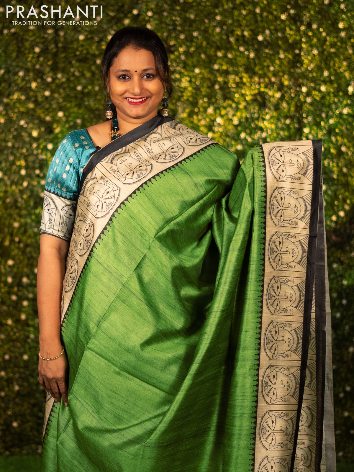 Chappa saree light green and cream with plain body and madhubani printed border
