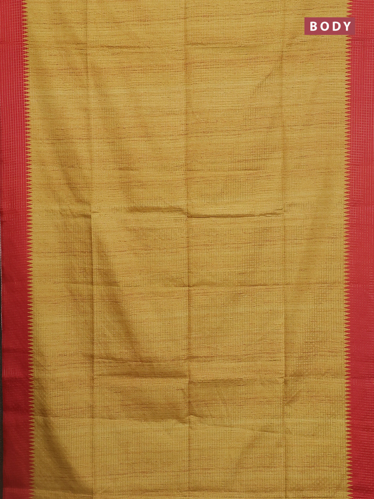 Chappa saree mustard yellow and red with allover zari checked pattern and printed pallu