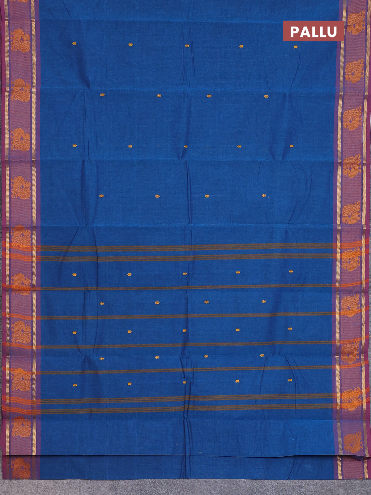 Chettinad cotton saree cs blue and maroon shade with thread woven buttas and zari woven annam butta border