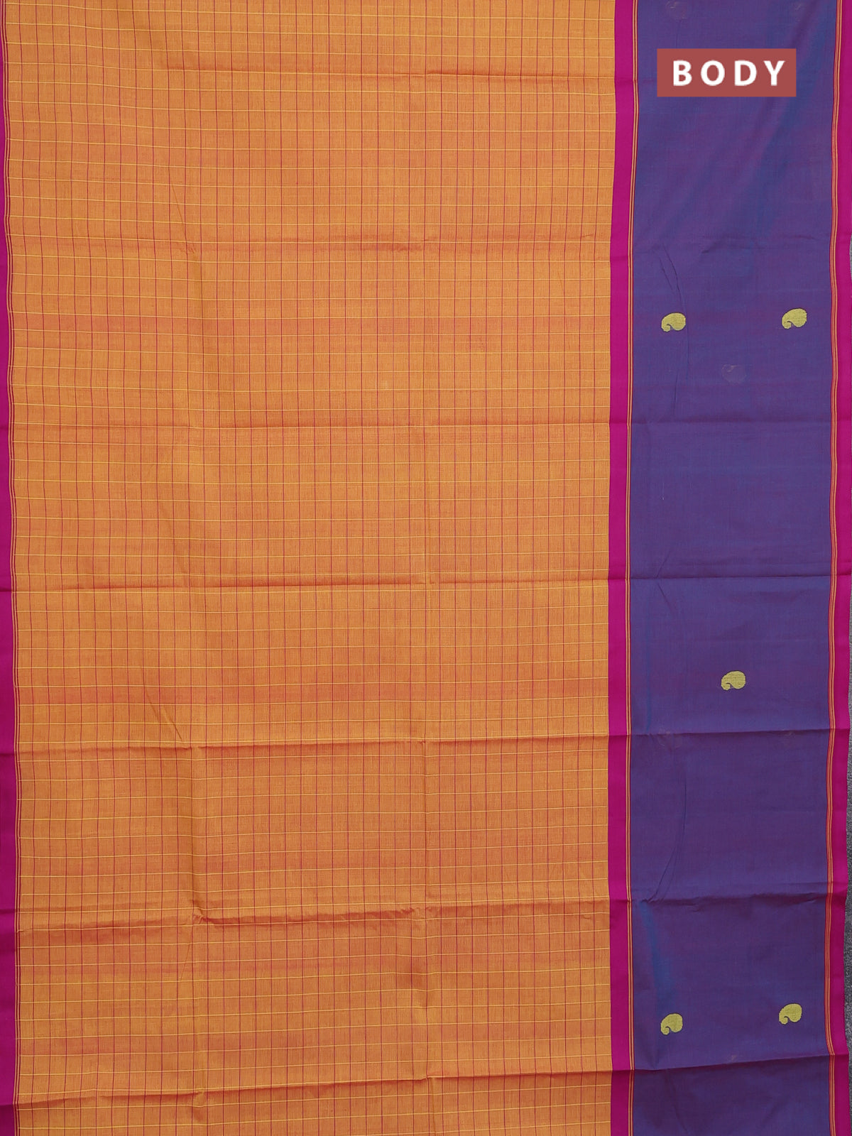 Chettinad cotton saree dark mustard and dual shade of violet with allover checked pattren and long rettapet butta border